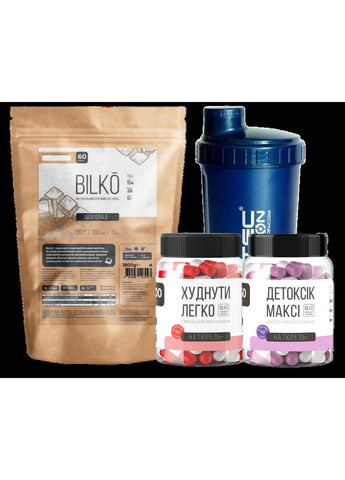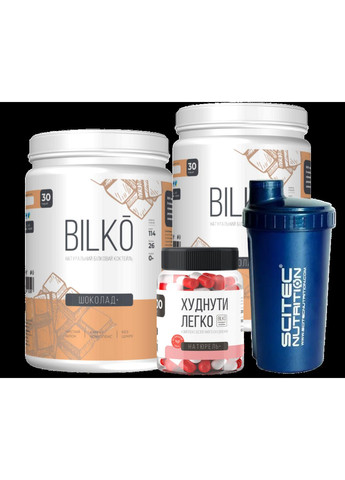 Комплект для схуднення: Натуральний Білковий Коктейль Bilko, Жироспалювач Худнути Легко, Детоксік Максі, Шейкер Відкрийте для себе повний комплекс для ефективного схуднення з нашою унікальною пропозицією! Комплект включає в себе: Натуральний Білковий Коктейль Bilko (2 банки по 0,9 кг, 60 порцій) - ідеальне джерело білка для підтримки м'язової маси і прискорення метаболізму. Натуральний склад забезпечує максимальну ефективність без шкоди для здоров'я. Жироспалювач Худнути Легко (100 капсул) - потужний жироспалювач, який допомагає прискорити процес спалювання жирів, збільшує рівень енергії та підтримує активний спосіб життя. Детоксік Максі (60 капсул) - ефективний засіб для детоксикації організму, що виводить токсини і покращує загальне самопочуття. Підтримує здоров'я печінки та покращує обмін речовин. Шейкер - зручний аксесуар для приготування коктейлів у будь-який час і в будь-якому місці. Легкість використання та практичність для вашого комфорту. Переваги нашого комплекту: Ефективне Схуднення: Білковий коктейль Bilko допомагає контролювати апетит, а жироспалювач прискорює процес спалювання жирів, сприяючи швидкому і стійкому зниженню ваги. Натуральні Інгредієнти: Усі продукти в комплекті виготовлені з натуральних інгредієнтів, що гарантує безпеку та високу ефективність. Комплексний Підхід: Одночасне використання білкового коктейлю, жироспалювача та детокс-засобу забезпечує комплексний підхід до схуднення і поліпшенню загального самопочуття. Зручність і Практичність: Шейкер дає змогу легко та швидко приготувати смачні та корисні коктейлі в будь-якому місці. Як використовувати: Білковий Коктейль Bilko: Змішайте одну порцію (30 г) з 250-300 мл води або молока, збовтайте в шейкері й насолоджуйтеся. Приймайте 1-2 рази на день, переважно після тренування і/або між прийомами їжі. Як і коли пити? 1. Випийте один коктейль замість сніданку, якщо вам не подобається ранкова їжа. 2. У день тренування до або після занять. 3. За 2 години до сну, щоб не навантажувати шлунок важкою їжею. 4. Візьміть із собою коктейль і пийте замість закуски. Протеїновий коктейль не є повноцінною дієтою. Ваш організм також потребує клітковини, жирів і вуглеводів. Включіть до свого раціону: каші, овочі, олії та горіхи. Використовуйте коктейль замість закуски і як додаткове джерело білка. В 1 порції (30 гр): Білків: 26 гр Вуглеводів: 0,9 гр Жирів: 1,0 гр Енергетична цінність: 114 ккал Доступні смаки: Шоколад Банан Ваніль Класичний (молочний) Полуниця Лісова ягода Склад: Гідролізований ізолят сироваткового білка (87%), натуральні та ідентичні натуральним ароматизатори, емульгатор - соєвий лецитин, сукралоза. Без цукру Без ГМО Жироспалювач Худнути Легко: Склад на порцію 2 капс: Ацетил-L-Карнітин – 200 mg L-Тирозин – 100 mg Вітамін В6 – 0,5 mg Спосіб застосування: Порція (2 капсули) вживати 1 раз на день внутрішньо, запиваючи водою, за 30 хв перед їжею. Увага: Не застосовувати при непереносимості. Зберігати щільно закритим у сухому місці при температурі від +1С до +25С Детоксік Максі: Склад на порцію 2 капс: Холін/розторопша – 200 mg Вітамін В6, калій – 100 мг Залізо, цинк/ехінацея – 100 мг Спосіб застосування: Порція (2 капсули) вживати один раз на день внутрішньо, запиваючи водою під час їжі. Попередження: Не застосовувати при нестерпності. Зберігати щільно закритим у сухому місці при температурі від +1С до +25С Замовте наш