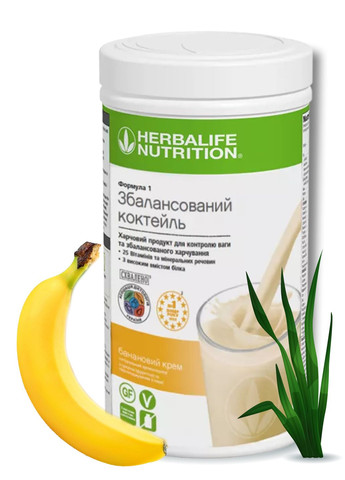 Протеїновий коктейль Формула 1 – продукт-бестселер у лінійці Herbalife Nutrition. Його унікальний склад допомагає організму отримати всі необхідні поживні речовини без споживання зайвих калорій. Його основний нутрієнт – білок – найважливіший будівельний матеріал нашого організму. Він бере участь практично у всіх внутрішніх процесах: сприяє формуванню та зміцненню м’язової маси, відіграє важливу роль у відновленні тканин, є джерелом енергії, а також надовго забезпечує відчуття ситості. Також у складі харчові волокна та комплекс із більш ніж 20 найважливіших вітамінів та мінералів, включаючи вітаміни B6, B12, D та C. Це збалансована їжа в склянці, якою можна замінити повноцінний прийом їжі, забезпечивши організм необхідним набором поживних речовин. Містить збалансовану комбінацію необхідних поживних речовин та готується всього за 2 хвилини! ПЕРЕВАГИ: Порція коктейля містить 17 г цінного білка. Збалансована їжа у склянці: білок, вітаміни, мінеральні речовини та харчові волокна Повноцінний прийом їжі за 2 хвилини. Основа програми зниження ваги Herbalife Nutrition. Високий вміст білка забезпечує відчуття ситості на кілька годин. Ефективність підтверджена клінічно Виготовляється з веганських інгредієнтів Не містить глютену Не має штучних барвників СМАК: Банановий крем ДІЯ: Біотин відіграє важливу роль у метаболізмі білків і жирів. Вітамін А покращує зір; необхідний для здоров’я кісток. Вітамін В6 відіграє важливу роль в метаболізмі білків, необхідний для здоров’я шкіри та нервової системи. Вітамін В12 має основні мінеральні елементи; необхідний для створення червоних кров’яних тілець. Вітамін С- антиоксидант; сприяє зміцненню імунітета і підтримці здоров’я шкіри. Вітамін D3- покращує засвоєння калія і фосфора, необхідних для зміцнення тканин кісток і зубів. Вітамін Е- антиоксидант, необхідний для нормального функціонування серця, м’язів нервової системи, системи кровообігу. Залізо відіграє ключову роль в кровообігу, так як воно необхідне для транспортування кисню червоними кров’яними тільцями. Калій сприяє підтримці водно-сольового балансу в клітинах і тканинах; особливо необхідний на програмі зниження ваги. Клітковина оптимізує процес травлення, сприяє очищенню організма від токсинів. Кальцій необхідний для міцності кісткової тканини і зубів, для нормального функціонування серця і м’язів. Магній- дуже важливий мінерал для м’язів, нервової системи, вироблення енергії, для підтримки здоров’я репродуктивної та імунної систем, для відновлення та оновлення тканин. Рибофлавін- покращує зір, приймає участь в процесі преретворення білків, жирів та вуглеводів в енергію. Тіамін приймає участь в синтезі енергії; необхідний для підтримки нервової системи. Фолієва кислота сприяє росту та відновленню клітин; особливо важлива для жінок в дітородному віці. СКЛАД: Рослинний білок – ізолят соєвого білка; Клітковина; Мінімальна кількість жирів. Більше 20 вітамінів та мінералів; близько 50% рекомендованого добового споживання вітамінів у 1 порції. Усього 200 ккал з урахуванням 250 мл молока 1,5% жирності СПОСІБ ВЖИВАННЯ: Дорослим розмішати 2 столові ложки продукту (26 г) у 250 мл знежиреного молока (1,5% жирності). РЕКОМЕНДАЦІЇ: - для збалансованого харчування і контролю ваги: замініть один основний прийом їжі на день протеїновим коктейлем Формула 1. Класично н