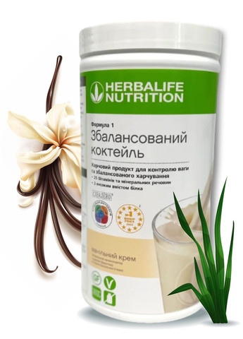 Протеїновий коктейль Формула 1 – продукт-бестселер у лінійці Herbalife Nutrition. Його унікальний склад допомагає організму отримати всі необхідні поживні речовини без споживання зайвих калорій. Його основний нутрієнт – білок – найважливіший будівельний матеріал нашого організму. Він бере участь практично у всіх внутрішніх процесах: сприяє формуванню та зміцненню м’язової маси, відіграє важливу роль у відновленні тканин, є джерелом енергії, а також надовго забезпечує відчуття ситості. Також у складі харчові волокна та комплекс із більш ніж 20 найважливіших вітамінів та мінералів, включаючи вітаміни B6, B12, D та C. Це збалансована їжа в склянці, якою можна замінити повноцінний прийом їжі, забезпечивши організм необхідним набором поживних речовин. Містить збалансовану комбінацію необхідних поживних речовин та готується всього за 2 хвилини! ПЕРЕВАГИ: Порція коктейля містить 17 г цінного білка. Збалансована їжа у склянці: білок, вітаміни, мінеральні речовини та харчові волокна Повноцінний прийом їжі за 2 хвилини. Основа програми зниження ваги Herbalife Nutrition. Високий вміст білка забезпечує відчуття ситості на кілька годин. Ефективність підтверджена клінічно Виготовляється з веганських інгредієнтів Не містить глютену Не має штучних барвників СМАК: Ванільний крем ДІЯ: Біотин відіграє важливу роль у метаболізмі білків і жирів. Вітамін А покращує зір; необхідний для здоров’я кісток. Вітамін В6 відіграє важливу роль в метаболізмі білків, необхідний для здоров’я шкіри та нервової системи. Вітамін В12 має основні мінеральні елементи; необхідний для створення червоних кров’яних тілець. Вітамін С- антиоксидант; сприяє зміцненню імунітета і підтримці здоров’я шкіри. Вітамін D3- покращує засвоєння калія і фосфора, необхідних для зміцнення тканин кісток і зубів. Вітамін Е- антиоксидант, необхідний для нормального функціонування серця, м’язів нервової системи, системи кровообігу. Залізо відіграє ключову роль в кровообігу, так як воно необхідне для транспортування кисню червоними кров’яними тільцями. Калій сприяє підтримці водно-сольового балансу в клітинах і тканинах; особливо необхідний на програмі зниження ваги. Клітковина оптимізує процес травлення, сприяє очищенню організма від токсинів. Кальцій необхідний для міцності кісткової тканини і зубів, для нормального функціонування серця і м’язів. Магній- дуже важливий мінерал для м’язів, нервової системи, вироблення енергії, для підтримки здоров’я репродуктивної та імунної систем, для відновлення та оновлення тканин. Рибофлавін- покращує зір, приймає участь в процесі преретворення білків, жирів та вуглеводів в енергію. Тіамін приймає участь в синтезі енергії; необхідний для підтримки нервової системи. Фолієва кислота сприяє росту та відновленню клітин; особливо важлива для жінок в дітородному віці. СКЛАД: Рослинний білок – ізолят соєвого білка; Клітковина; Мінімальна кількість жирів. Більше 20 вітамінів та мінералів; близько 50% рекомендованого добового споживання вітамінів у 1 порції. Усього 200 ккал з урахуванням 250 мл молока 1,5% жирності СПОСІБ ВЖИВАННЯ: Дорослим розмішати 2 столові ложки продукту (26 г) у 250 мл знежиреного молока (1,5% жирності). РЕКОМЕНДАЦІЇ: - для збалансованого харчування і контролю ваги: замініть один основний прийом їжі на день протеїновим коктейлем Формула 1. Класично н