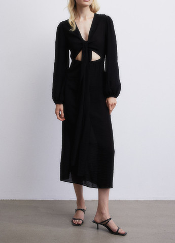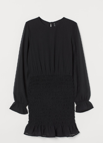 Коротка сукня із тканого матеріалу із поліестеру вторинної переробки зі спідницею на вафельній гумці. Круглий виріз горловини та довгі широкі рукави з потайною гумкою та оборкою знизу. Відрізна талія, спідниця, що облягає, з воланом знизу. Розріз ззаду з гудзиком у горловини. Підкладка із поліестеру вторинної переробки.