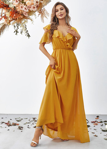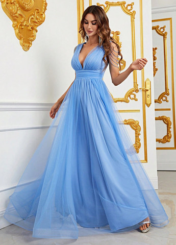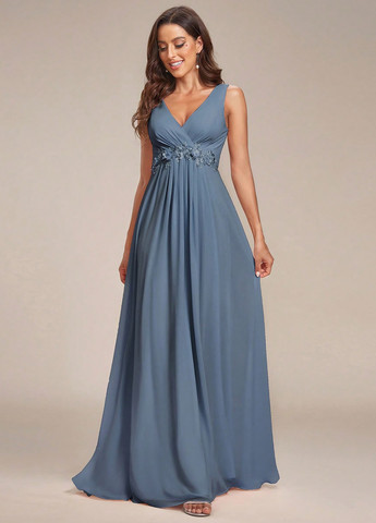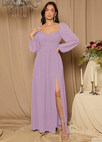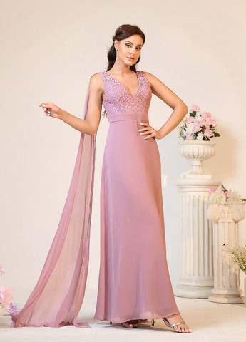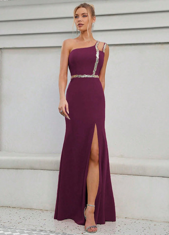 Витончена та гламурна сукня подружки нареченої з глибоким V-подібним вирізом, срібними паєтками та поясом на талії. Плісована шифонова тканина елегантно драпірується на тілі, відрізняється відкритою спиною, застібкою-блискавкою і силуетом, що облягає. З розрізом на стегні тканина не тягнеться.