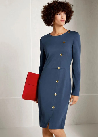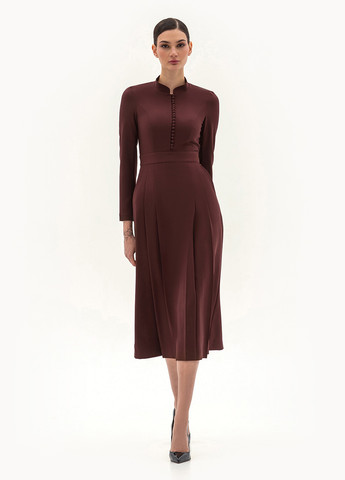 Вид виробу: силуетна сукня з акцентованою лінією талії, зі складками по нижній частині, коміром-стійкою та декоративною застібкою на безлічі ґудзиків по поличці. Силует і довжина: напівприлеглий верх + спідниця, що розкльошує, довжина — міді. Посадка по талії: класична. Матеріал: текстиль середньої густини. Застібка: блискавка. Підкладка: є. Кишені: підкрійні. Виріз: круглий. Рукав: втачний, тришовний. Особливість: модель маломір.