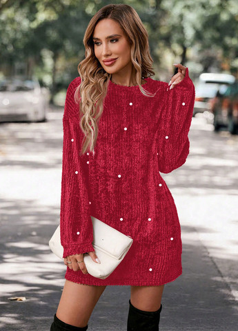 Ця стильна сукня створена, щоб зачаровувати та дарувати святковий настрій. Її оригінальний дизайн підкреслить вашу чарівність, перетворивши вас на зірку будь-якого заходу. Вільний крій у стилі "летюча миша" додає образу легкості та витонченості, створюючи вигляд невимушеної елегантності. Модель виготовлена з комфортного креп-дайвінгу, а рукави прикрашені вишуканими блискітками, які граційно переливаються при кожному русі й виблискують у світлі. На рукавах передбачені акуратні манжети, а вздовж усієї сукні позаду проходить елегантний шов. Ця сукня подарує вам не лише стильний образ, але й чарівні моменти незабутнього святкового вечора.