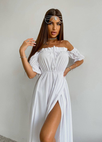 Коротка сукня з атласа, що м'яко драпірується, з круглим вирізом горловини зі збірками і V-подібним вирізом на вузьких зав'язках зверху. Вільний крій з об'ємними рукавами-ліхтариками довжиною до ліктя, вирізом реглан і вузьким поясом на талії. Без підкладки. ***Розмір - S Напівобхват пояса - 64,00 см Довжина виробу - 83,00 см Об'єм грудей - 120,00 см Напівобхват стегон - 75,00 см Можливе пошкодження бірки