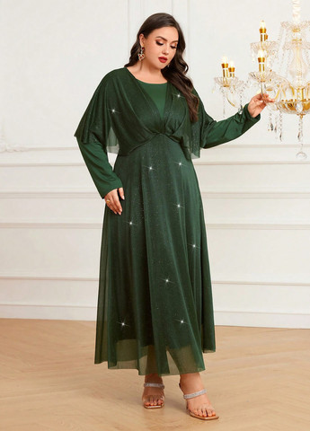 Це довга вечірня сукня з елегантним дизайном із круглою горловиною та витонченими рукавами. Виготовлено з тканини з невеликою еластичністю, сукня має однотонний малюнок та темно-зелений колір. Вона має класичну подовжену посадку та доповнено накидкою для додаткового гламуру.