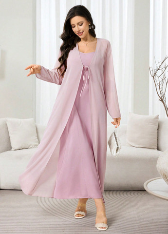 Святкове вбрання DAZY із двох предметів для побачення. Це вбрання складається з накидки з круглим вирізом, рукавами-ліхтариками та приталеної сукні з квадратним вирізом на талії. Підходить для офіційних та вечірніх заходів, включаючи Рамадан, Ід аль-Адха та Ід аль-Фітр. Наряд виготовлений із 100% поліестеру. Сукня довжиною міді та накидка з короткими рукавами. Елегантний фасон, класичний крій. Інструкції з догляду: тільки ручне прання.