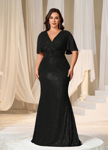 Сукня-SA-438. Чорна сукня-трапеція з блискучими рукавами. Ошатне крепове Сукня-трапеція з розкльошеним вільним кроєм і довжиною до колін. Модель з довгими блискучими рукавами-дзвонами та закритою горловиною. Виміри виробу: Напівобхват: Груди: S (47), M (49), L (51), XL (53), Талія: S (52), M (54), L (56), XL (58), Стегна : S (58), M (60), L (62), XL (64), Довжина виробу - 90, Рукав - 75, Тканина: Середньої еластичності. Матеріал - Креп/сітка/паєтки. Будь ласка, орієнтуйтесь на виміри виробу, зазначені в описі товару.