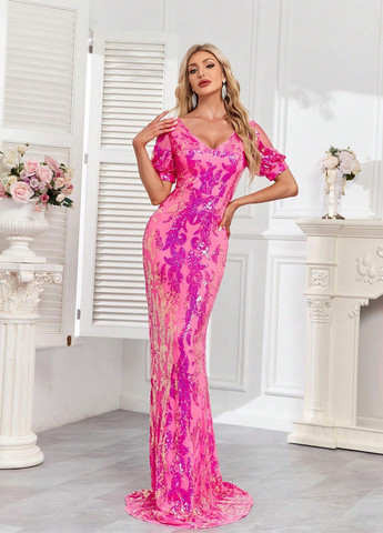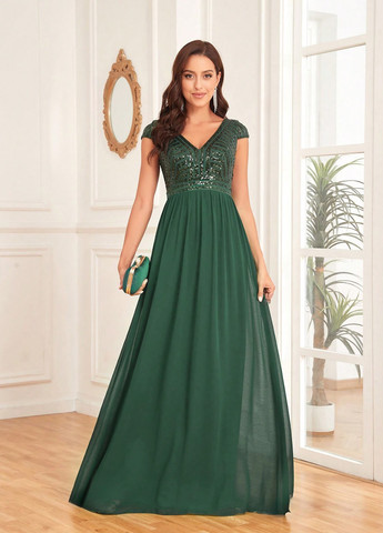 Жіноча святкова сукня міді довжини, створена для особливих подій. Виготовлена з креп-дайвінгу, зверху прикрашена блискучими паєтками на рукавах і грудях. Довгий суцільнокроєний рукав та круглий виріз забезпечують елегантний вигляд. Сукня приталеного крою, без кишень. Ідеальний вибір для святкування, корпоративу або вечірки.