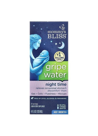 Водичка від колік 1+ місяців Mommy's Bliss Night Time Gripe Water, 120 мл Night Time Gripe Water від Mommy's Bliss — це спеціально розроблений рідкий засіб для немовлят від одного місяця, який допомагає зменшити прояви колік, здуття та газоутворення, а також сприяє спокійному сну малюка. Формула поєднує натуральні рослинні екстракти, зокрема імбир і фенхель, які традиційно використовуються для підтримки здоров’я травної системи у дітей. Додатково до класичної водички від колік у цій версії міститься екстракт ромашки, що відомий своїми заспокійливими властивостями, і лимонний бальзам, який допомагає малюкові розслабитися перед сном. Продукт не містить цукру, спирту, штучних ароматизаторів, барвників та консервантів, тому підходить навіть для найменших дітей із чутливою травною системою. Водичка легко дозується та має приємний смак, що полегшує її вживання навіть вибагливим малюкам. Mommy's Bliss Night Time Gripe Water — це підтримка спокійних ночей для всієї родини. Ключові переваги: Зменшення колік та газів: Сприяє полегшенню симптомів здуття й коліків у немовлят. Підтримка спокійного сну: Екстракт ромашки та лимонного бальзаму допомагає малюку розслабитися перед сном. Натуральний склад: Містить рослинні екстракти, без цукру, спирту та штучних добавок. Легкість у застосуванні: Зручна форма випуску та приємний смак для немовлят. Безпечність: Підходить для дітей від 1 місяця, не викликає звикання. Рекомендації щодо застосування: Перед використанням добре збовтайте флакон. Для дітей від 1 місяця рекомендується давати 5 мл (1 чайна ложка) за допомогою мірного дозатора або шприца безпосередньо в рот малюка за 30 хвилин до сну. Не перевищуйте рекомендовану дозу. Можна використовувати щодня за потребою, але не більше 6 разів на добу. Перед першим застосуванням проконсультуйтеся з педіатром. Поживна цінність Розмір порції: 1 мл, 2 мл, 5 мл (1 ч. л.) Порцій в упаковці: 120, 60, 24 Кількість в 1 порції % від добової норми для немовлят віком 4–6 тижнів Кількість в 1 порції % від добової норми для немовлят віком 6–10 тижнів Кількість в 1 порції % від добової норми для немовлят віком від 10 тижнів до 6 місяців Калорії 0 5 10 Натрій 0 мг † 5 мг † 10 мг † Усього вуглеводів 0 г 0 % 1 г 1 % 2 г 2 % Гліцерин 0 г † 1 г † 2 г † Суміш Bedtime Bliss Blend™ квітки органічної ромашки (Matricaria recutita), надземні частини органічної пасифлори, включно з листям (Passiflora incarnata), і надземні частини органічної меліси, включно з листям (Melissa officinalis) 2,6 мг † 5,2 мг † 13 мг † Органічний корінь імбиру Zingiber officinale (Зінгібер лікарський) 1 мг † 2 мг † 5 мг † Насіння органічного фенхелю (Foeniculum vulgare) 0,8 мг † 1,6 мг † 4 мг † † Добову норму не визначено. Протипоказання: Не рекомендується дітям із підвищеною чутливістю або алергією на будь-який компонент засобу. Якщо у дитини виникає висип, блювання, діарея чи інші ознаки непереносимості — негайно припиніть використання та зверніться до лікаря. Не застосовувати дітям молодше 1 місяця. Умови зберігання: Зберігайте флакон у сухому, темному місці при температурі не вище +25°C. Після відкриття використати протягом 6 тижнів. Тримати в недоступному для дітей місці. Де придбати: Придбати водичку від колік Night Time Gripe Water 1 Month+ від Mommy's Bliss можна лише в інтернет-магазині Djini. Переваги покупки в нашому магазині: Гарантія оригінальності та якості дитячих товарів. Оперативна доставка по всій Україні. Зручні способи оплати та швидке оформлення зам