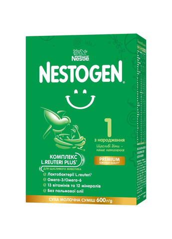 Суха молочна суміш Nestogen (Нестожен) 1 з лактобактеріями L. Reuteri розроблена з урахуванням фізіологічних потреб дитини та сприяє її гармонійному зростанню та розвитку. Основні переваги: спеціально розроблена для забезпечення збалансованого здорового харчування та комфортного травлення сприяє поліпшенню моторики кишківника, формуванню регулярних м'яких випорожнень, здорової мікрофлори та зменшенню колік у складі міститься дві особливі жирні кислоти DHA та ARA, які відіграють важливу роль у формуванні імунної системи та сприяють розвитку мозку та зору Рекомендації ВООЗ + Claims: Для харчування дітей грудного віку перевага надається грудному вигодовуванню. Ідеальною їжею для немовляти є молоко матері. Продовжуйте грудне вигодовування якомога довше. Перед тим, як прийняти рішення про штучне вигодовування з використанням дитячої суміші, зверніться за порадою до лікаря педіатра. Умови зберігання: Після приготування суміші, упаковку з сумішшю, що залишилася, слід щільно закрити і зберігати в сухому місці вдалині від сонячних променів Не рекомендується зберігати в холодильнику. Після відкриття слід використовувати протягом 3-х тижнів. До та після відкриття продукт зберігати при температурі від 6 до 25° C. Термін придатності: 18 місяців (дата виготовлення (MAN), придатний до (EXP) та номер партії вказані на дні банки. Рекомендації щодо використання: Суміш потрібно готувати безпосередньо перед кожним годуванням. Точно дотримуйтесь інструкцій. Готову суміш, що залишилася після годування, не можна зберігати та використовувати надалі. Під час годування необхідно підтримувати дитину, щоб вона не захлинулась Коли дитина підросте, переходьте на годування з чашки. Використання некип'яченої води та непрокип'ячених пляшечок, неправильне зберігання, транспортування, приготування та годування можуть несприятливо вплинути на здоров'я дитини. Забороняється використання води з колодязів та каптажних джерел для приготування дитячого харчування. Для зберігання кількості живих бактерій у готовій суміші, кип'ячену воду слід остудити до температури тіла (37 °С), після чого додати суху суміш. Для приготування суміші необхідно користуватися мірною ложкою, заповненою без гірки. Розведення неправильної кількості порошку - більшої чи меншої порівняно з кількістю, зазначеною в таблиці, - може призвести або до зневоднення організму дитини, або до порушення її харчування. Вказані пропорції не можна змінювати без поради лікаря. Характеристики Упаковка: картонна пачка 600 г Виробник: Nestogen, Нідерланди. Рекомендовано для дітей від народження.