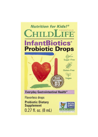 Властивості продукту: Підтримує здоров'я шлунково-кишкового тракту Підтримує здоров'я та цілісність слизової оболонки кишечника Підтримує баланс мікрофлори кишечника Сприяє природному очищенню організму Підтримує роботу органів детоксикації Підтримує здоровий баланс мікрофлори кишечника Підтримує імунну систему Показання до застосування Немовлята від народження до 2 років: 5 крапель на день. Інструкція з використання. 1. Витягніть пляшечку з упаковки. 2. Усадка є природною. Енергійно струсіть перед дозуванням. 3. Зніміть білу кришку з пляшечки. 4. Переверніть пляшечку. 5. Злегка постукайте вказівним пальцем по дну пляшечки, щоб з неї почав капати засіб. Що це? Це дитячий пробіотичний комплекс, який сприяє балансу мікрофлори в кишечнику та хорошому імунітету, правильному травленню та кращому засвоєнню всіх поживних речовин, які отримують разом з їжею. Кожна порція збагачена добовою нормою вітаміну D. Краплі без смакових добавок зручні у використанні. Як це працює? Пробіотики є особливими бактеріями у кишковому середовищі людини. Це корисні мікроорганізми, які допомагають впоратися органам травлення з різними захворюваннями та наслідками недружніх втручань, наприклад, результатами прийому антибіотиків. Головним завданням пробіотиків є відновлення та захист мікрофлори кишечника. Пробіотики призначені для підтримки здорової функції шлунково-кишкового тракту, а здорова система травлення - це міцна основа для імунного здоров'я. Вони знищують шкідливу флору починаючи з ротової порожнини, очищають організм від шлаків і токсинів, допомагають боротися з кишковими вірусами. При щоденному прийомі дитячі пробіотики можуть допомогти заповнити корисні бактерії в мікробіомі, щоб захистити дітей від шкідливих бактерій. Елемент Вага Одиниця Відсоток Відсоток Порція 5 (0,20) крапель (мл) Порцій в упаковці 35 добової норми для малюків 0-12 місяців добової норми для дітей 1-2 років Калорії 0 Усього вуглеводів 0 г 0% 0%** Усього цукру 0 г † † Містить 0 г доданого цукру † 0%** Вітамін D3 (у вигляді холекальциферолу) 10 (400) мкг (МО) 100% 67% Суміш пробіотиків біфідобактерії лонгум (Bifidobacterium longum) KABP™-041, педіокок (Pediococcus pensosaceus) KABP™-042 8,33 (1) мг (млрд КУО) † † ** Відсоток від добової норми за умови споживання 1000 калорій на день. † добова норма не визначена