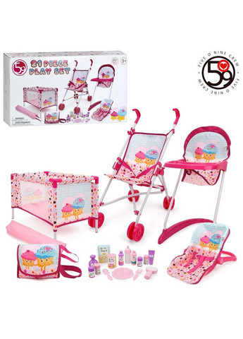 **Ігровий набір для ляльки Five O Nine 21 предмет, коляска, стільчик, манеж, шезлонг, аксесуари** Ігровий набір **Five O Nine 21 Piece Play Set** — це повноцінний комплект для турботливих маленьких батьків, який допоможе дитині піклуватися про улюблену ляльку. У наборі є все необхідне для прогулянок, годування та сну ляльки. ### **Характеристики:** * **Тип:** набір аксесуарів для ляльки * **Кількість предметів:** 21 * **Комплектація:** * Прогулянкова коляска (розмір 47 × 27,5 × 54,5 см) * Стільчик для годування * Манеж * Шезлонг / люлька-переноска (розмір 37 × 24 × 13 см) * Сумка для аксесуарів * Набір пляшечок, посуду та засобів догляду * **Матеріал:** метал + пластик + тканина * **Ручка:** регульована по висоті * **Рекомендований вік:** від 3 років * **Упаковка:** коробка ### **Особливості:** * Міцна металева конструкція з легкими пластиковими деталями * Яскравий дизайн із малюнками морозива * Усе необхідне для гри в "маму і доньку" * Допомагає розвивати уяву, турботливість і дрібну моторику **Five O Nine Play Set** — це чудовий подарунок для дівчаток, який забезпечить безліч годин цікавої гри з улюбленими ляльками.