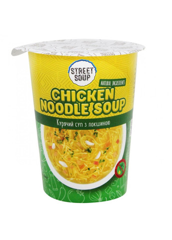 Курячий суп з локшиною Street Soup 32 г в стакані - це натуральний суп миттєвого приготування в зручному паперовому стакані! Це Ваш швидкий, корисний, повноцінний обід для всієї родини або великої компанії! 1 стакан = 280 г готового супу. Курячий суп з локшиною - ідеально підходить: Для улюблених подорожей. Для трекінгу, хайкінгу або бекпекінгу. Якщо у Вас немає вдосталь часу для приготування їжі. Коли Ви займаєтесь спортом. Чи працюєте Ви в офісі, хочете швидко приготувати обід вдома або йдете з друзями в похід - візьміть курячий суп з локшиною з собою! Відкрийте паперовий стакан, додайте 250 г (1 склянку) гарячої води та перемішайте ложечкою (в стакані). Зачекайте 8 хв. Ваш курячий суп з локшиною готовий! Смачного! У складі лише натуральні інгредієнти. Без додавання олії!
