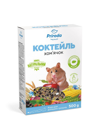 Повноцінний вітамінізований корм основний раціон для хом яків. Рецептура корму розроблена спеціально для хом ячків, які утримуються в домашніх умовах. Вона складена у відповідності до рекомендацій ветеринарів та фахівців з розведення гризунів. Корм містить всі необхідні компоненти, які забезпечують улюбленців вітамінами, мінералами та іншими корисними речовинами. Грануляти та пресоване трав яне борошно допомагають гризунам сточувати зуби, покращувати травлення та нормалізувати обмін речовин. Овес та насіння гарбуза збагачують меню амінокислотами, калієм, кальцієм, магнієм та цинком. Фрукти та овочі допомагають зміцнити імунітет. Склад: вівсяні пластівці, крупа горохова, ячмінь, насіння соняшнику, кукурудза, арахіс, яблуко сушене гранульоване, гречка, пшениця, насіння гарбуза, фруктово-зерновий гранулят, овочево-зерновий гранулят, злаково-трав яний гранулят, трав яний гранулят в асортименті, просо жовте, просо червоне, сушена морква, кероб подрібнений, горобина, овес, комбікорм. Рекомендації: Годувати 2-3 рази на день невеликими порціями, корм кожного разу насипати в чисту суху годівницю. Слідкуйте за тим, щоб в поїлці завжди була свіжа вода.