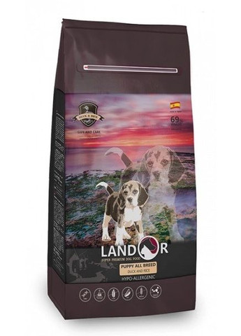 LANDOR Puppy All Breed Duck & Rice - Високоживильний гіпоалергенний сухий корм з качкою та рисом для цуценят всіх порід віком від 1 до 12-16 місяців. Забезпечує збалансоване харчування для Вашого улюбленця протягом усього періоду дорослішання, допомагаючи організму цуценя формувати та підвищувати імунітет, зміцнювати кістки та зуби, поступово та правильно набирати м'язову масу, а також підтримувати високу активність та здатність до навчання. Завдяки сучасним технологіям виробництва та добірній високоякісній сировині натурального походження корм зберігає максимум корисних властивостей та початкові смакові якості інгредієнтів, що використовуються. Основу формули корму складають гіпоалергенні та високозасвоювані компоненти, що дозволяє уникнути несприятливих реакцій з боку органів травної системи та алергічних проявів у тварин, чий організм має до них схильність. Високий відсоток та правильне співвідношення білків тваринного походження та жирів у складі корму гарантують повноцінне насичення організму необхідними поживними речовинами в період активного росту та набору м'язової маси. М'ясо качки має відмінні смакові якості і є джерелом легкозасвоюваного протеїну, вітамінів групи В, ретинолу, рибофлавіну, вітаміну Е, пантотенової, а також нікотинової кислоти, яка сприяє зниженню рівня холестерину в крові. Рис забезпечує організм необхідною кількістю вуглеводів для підтримки енергійності та активності улюбленця під час ігор, навчання та дресирування, на які улюбленець витрачає багато своїх сил Наявність у кормі цинку, заліза, кальцію, фосфору та міді сприяє мінералізації кісткової тканини, що впливає на міцність зубів та всього скелета тварини. Крім пребіотиків, що містяться в продуктах, корм додатково збагачений фруктоолігосахаридами з рослинної клітковини і пивними дріжджами, які створюють в кишечнику сприятливе середовище для розвитку корисних бактерій. Сушені овочі, фрукти та ягоди несуть величезну користь для організму, адже вони самі по собі є джерелом великої кількості вітамінів. Додавання пробіотиків сприяє поповненню та нормалізації кишкової мікрофлори, що у свою чергу позитивно впливає на процеси перетравлення їжі, засвоєння поживних речовин та здатність організму захищати себе від патогенних бактерій. Качиний жир та олія лосося багаті незамінними жирними кислотами Омега-3 та Омега-6, недолік яких може спровокувати проблеми зі шкірою та порушення роботи нервової, ендокринної, серцево-судинної та травної систем. Біотин і цинк сприятливо впливають на стан шкіри та вовни, покращуючи зовнішній вигляд улюбленця та підкреслюючи його красу, яка в першу чергу є ознакою відмінного здоров'я тварини. Зміцненню та підтриманню еластичності хрящової тканини суглобів сприятимуть глюкозамін та хондроїтин, що входять до складу корму у достатній кількості Екстракт юкки Шидігера, потрапляючи в кишечник, нормалізує та покращує процес травлення, а також знищує суперечки грибків та хвороботворні бактерії, що сприяє очищенню організму собаки та зменшенню запаху екскрементів. Як прикорм може використовуватися для цуценят віком від 3 тижнів. Не містить штучних барвників, ароматизаторів та консервантів