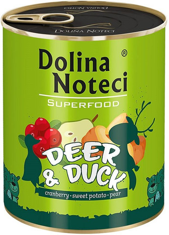 Вологий корм для собак, що містить до 80% м'яса та продуктів тваринного походження (40% оленя, 40% качки). Також до складу входять свіжі фрукти та натуральні добавки з дуже високим вмістом біологічно активних інгредієнтів, які позитивно впливають на організм собаки, наприклад новозеландські мідії або морські водорості. Беззерновий бездієтичний корм був розроблений у співпраці з експертами з годівлі тварин. Відрізняється рецептом, в якому використовуються види м'яса з особливими властивостями: Олень - переваги м'яса оленя обумовлені здоровим способом життя, який веде ця тварина: дотриманням природного раціону, заснованого на свіжому листі, травах і травах, а також інтенсивної щоденної фізичної активності. В результаті в ньому мало жиру та багато білка. Крім того, у ньому немає антибіотиків та гормонів. З цих причин м'ясо оленя рекомендоване алергікам. Оленіна є багатим джерелом ненасичених жирних кислот - у порівнянні з яловичиною, вона містить до 5 разів більше n-3 кислот, які включають турботу про імунітет і допомагають запобігти раку. Вітаміни B3 (ніацин) та B12, що містяться в м'ясі оленя, підтримують, у тому числі нервова система. Цинк підтримує шкіру та шерсть у хорошому стані та сприяє правильній роботі імунної системи. Качка - поживний і багатий білком шляхетний вид свійської птиці. Для типового промислового розведення качки не підходять. Вони походять виключно з невеликих ферм, де вони можуть вільно виходити на вулицю та харчуються зерном злаків. М'ясо качки, незважаючи на високу калорійність, містить багато здорових жирів і має відповідний для здоров'я профіль незамінних жирних кислот. Крім того, він забезпечує велику дозу заліза, яке запобігає анемії, є антиоксидантом і запобігає раковим змінам селену та забезпечує правильне функціонування шкіри, цинку, а також вітамінів групи В, що впливають на весь організм. Склад олень 40% (м'ясо 20%, легені, печінка), качка 40% (печінка, серця, шлунки, м'ясо 5%), бульйон, журавлина 3%, мінеральні речовини, батат 1%, горох 0.5%, груша 0.5%, сушені пивні дріжджі 0.3% (джерело пребіотиків: маннаноолігосахариди та β-глюкани), насіння льону 0.1%, насіння подорожника, юкка Мохаве, морські водорості, новозеландські зелені. 0.2%, глюкозамін 0.02%, хондроїтину сульфат 0.02%. Аналітичний склад сирий протеїн – 11%, сирий жир – 7.5%, сира зола – 2%, сира клітковина – 0.8%, волога – 76%, кальцій – 0.3%, фосфор – 0.25%. Добавки на кг Вітамін D3 – 450 МО, вітамін Е – 40 мг, цинк (оксид цинку, гідратований хелат амінокислоти) – 49.5 мг, марганець (оксид марганцю (II)) – 2 мг, мідь (сульфат міді, пентагідрат) – 0.4 мг йод (покритий, йодат кальцію гранульований, безводний) – 0.3 мг, Селен органічний, що продукується штамом Saccharomyces cerevisiae CNCM I-3060 – 0.01 мг.