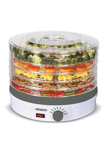 Сушарка для овочів та фруктів Ardesto FDB-5321T Сушарка Ardesto FDB-5321T - допоможе зберегти свіжий урожай фруктів, овочів, ягід, грибів, зелені, трав для подальшого використання протягом року, необхідний майже в кожному домогосподарстві. Крім того, можна висушити м'ясо чи рибу для приготування делікатесів чи запасів на зиму. Ardesto FDB-5321T білого кольору із сірою основою. Її кришка з отворами для повітря та п'ять піддонів діаметром 32 см та висотою 3 см – прозорі, що зручно для стеження за процесом сушіння. Температура сушіння регулюється від 40 до 70°С. Управління – електронне, потужність 250 Вт. На всіх рівнях продукти поступово висушуються із збереженням усіх мінералів та вітамінів. Наявність таймера від 1 до 48 год спрощує процес та економить час. Правильно висушені продукти легко відновити за допомогою води/пароварки. Вони практично можуть придбати свій первісний розмір, форму та вигляд. Характеристики: Кількість ярусів: 5 Потужність: 250 Вт Матеріал корпусу: пластик Регулювання температури: так Установка таймера: електронна Автовідключення за таймером: так Дисплей: так Захист від перегріву: так
