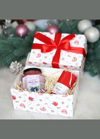 Подарунковий набір №75 Чудовий невеликий подарунок до Нового Року у коробочці з святковою наліпкою. У наборі: 8.5 см воскова свічка 240 г крем мед кава чи горіхи з медом Наповненням такого подарункового боксу до Нового року є продукція українського бренду сімейної пасіки, та має натуральну складову. Розмір 14*14*7 см