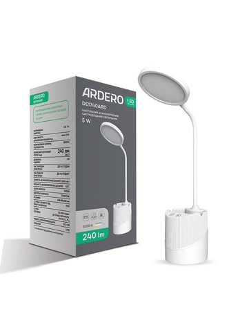 Акумуляторні настільні світлодіодні світильники Ardero DE1740ARD Нові моделі настільних світильників з акумулятором і органайзером для канцприналежності Настільні світлодіодні світильники для організації локального освітлення на робочому столі або зони читання й навчання. Переваги та особливості акумуляторного світлодіодного настільного світильника Ardero DE1740ARD: Дизайн Лаконічний дизайн ідеально підійде для сучасного інтер'єру офісу, робочого місця або дитячої. Світильник сконструйований із гнучкою ніжкою, що дає змогу спрямовувати світло в потрібному напрямку під необхідним кутом і має склянку для ручок та олівців. Високоякісні матеріали та комплектуючі Світильник виготовлений із якісного міцного пластику та має велику площу розсіювання, що забезпечує велику зону світіння й має функцію захисту очей, що створює комфортні умови для роботи. Керування світлом Для зручності використання й керування світлом на корпусі світильника розміщена сенсорна панель, що дає змогу плавно змінювати яскравість самого світла, підлаштовуючи його під різні потреби. Режим нічника Додаткова функція дає змогу використовувати світильник не тільки для роботи, але і як нічну підсвітку в кімнаті. Акумуляторна батарея Завдяки наявності акумуляторної батареї світильник можна використовувати й без під'єднання до мережі. Час роботи без під'єднання до мережі 3-4,5 години Час заряджання акумулятора до 4,5 годин Ємність батареї 1200 мА·год Гарантія 12 місяців Технічні характеристики можуть змінюватися залежно від партії