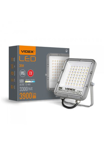 Світлодіодний прожектор PREMIUM VIDEX 30W 5000K AC/DC 12-48V Сучасний світлодіодний прожектор VIDEX - високотехнологічне джерело світла. Забезпечує рівний світловий потік і максимальну потужність з першої секунди роботи. Світлодіодний прожектор VIDEX - екологічна і економічна заміна ламп розжарювання і люмінесцентних ламп. Цей прожектор можливо використовувати для освітлення і підсвічування рекламних вивісок, конструкцій, автостоянок, гаражів, зовнішнього підсвічування будівель і споруд, спортивних майданчиків, стадіонів, промислових об'єктів, створення світлових ефектів. Його розміри становлять усього 160x138x26мм. Корпус LED прожектора має сірий колір і чудово протистоїть волозі, дощу, снігопадам та іншим погодним опадам. Клас захисту IP65 і високий захист від ударів IK07. Спеціальне захисне покриття збереже прожектор від подряпин під час монтажу або інших неприємностей у процесі експлуатації. Сила світлового потоку у прожектора VIDEX серії Premium значно вище, ніж у стандартного - 130 Лм/Вт, а сумарний світловий потік прожектора становить 3900Лм. Має тривалий термін експлуатації і високу стійкість до навантажень під час вмикання та вимикання (20 000). Ресурс роботи - 50 000 годин. Гарантія - 3 роки! Не містить шкідливих речовин.
