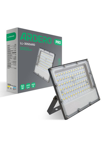 Світлодіодний прожектор Ardero LL-3050ARD PRO 50 Вт 6500 K IP65 сірий Лінійка світлодіодних прожекторів серії PRO з покращеними технічними характеристиками. Серія світлодіодних прожекторів створена для освітлення вуличних просторів, архітектурного підсвічування будівель, освітлення складських і виробничих приміщень, прибудинкової території, гаражів, рекламних конструкцій, воріт і паркінгів. Особливості та переваги прожектора Ardero LL-3050ARD PRO: Надійна конструкція: Прожектор має міцний алюмінієвий корпус і розсіювач із загартованого скла, що забезпечує захист від зовнішніх впливів. Високий рівень захисту: Завдяки класу захисту IP65 прожектор стійкий до пилу та вологи, що робить його ідеальним для використання на вулиці за будь-яких погодних умов. Прожектор може працювати в широкому діапазоні температур від -40 до +35 °C. Якісні світлодіоди: У прожекторі використовуються ефективні світлодіоди нового покоління, стійкі до виникнення світлових дефектів, що гарантує довговічність і стабільну роботу світильника. Якісний ІС-драйвер. Драйвер забезпечує стабільну роботу прожекторів у діапазоні напруги 100-277 В і захищає від наслідків перепадів напруги. Економія енергії: Прожектор дає змогу заощаджувати понад 80% енергії, порівнюючи з традиційними галогенними прожекторами, завдяки використанню світлової технології з енергоефективністю 120 лм/Вт. Світлодіодний прожектор Ardero LL-3050ARD PRO — це надійне й економне рішення для освітлення зовнішніх територій, що поєднує в собі високу якість матеріалів і передові технології. Технічні характеристики можуть змінюватися залежно від партії.