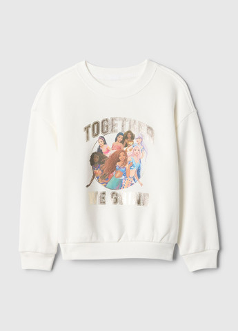 Дитячий світшот Disney Princess GAP. Світшот із м'якої тканини, утеплений флісом зсередини. Довгі рукави, еластичні манжети і поділ у рубчик. Круглий виріз. Спереду принт з принцесами з мультфільмів Disney і золотистий напис. Відмінна якість.