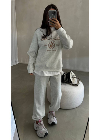 Стильний і затишний костюм для тих, хто цінує поєднання комфорту, трендовості та effortless chic. Ідеальний варіант для повсякденних образів, подорожей або прогулянок у міському стилі. Комплект складається з: • об’ємного світшота з принтом; • прямих брюк з манжетами на резинці. Фасон: oversize силует, який створює розслаблений і сучасний вигляд. Матеріал: м’який трикотаж на флісі — теплий, приємний до тіла, не кошлатиться після прання. Деталі: світшот із написом та емблемою в стилі “college”, манжети на рукавах і штанах забезпечують комфортну посадку.