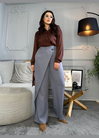 р846.3286 Прямі штани з ефектним асиметричним запахом спереду з костюмної тканини. Поєднуються з сорочками, футболками, світшотами та худи. Штани середньої посадки, з бічними кишенями. Застібка брюк на блискавку та гудзик, пояс ззаду на широкій резинці, для ідеальної посадки. Тканина: костюмка