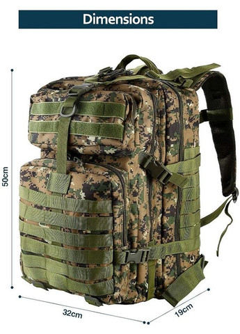 Чоловічий тактичний камуфляжний рюкзак - міцна зовнішня сумка для походів та полювання з міцними плечовими ременями, кілька відділень для спорядження та необхідних речей, бежевий колір, ідеально підходить для кемпінгу, подорожей та альпінізму, зовнішнє спорядження | Безпека зберігання | Міцна конструкція, спорядження для походів Mатеріал: Нейлон Нагода: Вихід Тип стрічки: Регульований плечовий ремінь Стиль: спорт Інструкція по догляду: Ручне прання Подробиці: Порожнистий Включені компоненти: Шнурок Тип закриття: блискавка Опис підкладки: Поліестер Популярні елементи: з'єднання Зручний, водонепроникний і міцний. Ви шукаєте прихований рюкзак, який можна адаптувати до ваших щоденних потреб? Від водонепроникної тканини військового класу до сітки Molle та спеціального розташування кишень, цей рюкзак розроблений, щоб ходити з вами в найжорстокіші умови та повертатися без ознак напруги. Він зручний і міцний, що робить його хорошим вибором для повсякденного використання. Військовий рюкзак має 2 великих основних відділення, 2 малих відділення спереду та 1 задню кишеню. Велике відділення має еластичний ремінь для зберігання ноутбуків або будь-чого, що ви не хочете переносити. Кожне відділення має сітчасту кишеню або кишеню на блискавці для організації Y-подібного ремінця у верхній частині, що дає змогу вмістити більше речей, таких як спальний килимок або світшот. А в бічні нижні кишені набагато зручніше покласти гаджети.