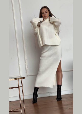 Жіночий костюм зі спідницею з щільної в'язаної ангори, яка не кошлатиться. Верх костюма — кофта з горловиною, довгими рукавами та заниженою лінією плеча. Спідниця з приталеним силуетом підкреслює фігуру, гумка на поясі. Позаду спідниці є акуратний шов. Такий комплект ідеально пасує для прохолодної погоди, підходить для повсякденного носіння або ділових зустрічей.