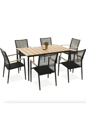Комплект садових меблів Di Volio Breno 6+1 Набір садових меблів Breno від Di Volio зробить ваш відкритий простір ідеальним місцем для відпочинку, зустрічі з друзями та спільного святкування їжі. Комплект складається з великого столу з прямокутною стільницею і шести зручних стільців з підлокітниками. Завдяки використанню міцних матеріалів меблі повністю стійкі до шкідливого впливу різних погодних умов. Поєднання алюмінієвої рами, техноротангу та тканини Textilene насиченого чорного кольору з контрастними елементами натурального бежевого відтінку надає меблям універсальний сучасний вигляд, який ідеально вписується як у мінімалістичний, так і в класичний дизайн саду та тераси. Стіл Функціональний і елегантний садовий стіл з просторою стільницею, що поєднує в собі стильний дизайн і довговічність використаних матеріалів. Алюмінієва конструкція з тонкими чорними ніжками та прямокутна стільниця з поліестеру гарантує високу міцність столу, стійкість до корозії, вологи, цвілі та комах, завдяки чому меблі зберігають свою естетичність протягом багатьох років. Стільниця виконана з чергування панелей поліну різної ширини, що точно імітує зовнішній вигляд і структуру натуральної деревини, і при цьому легко підтримувати в чистоті і не потребує сезонного догляду. Стіл має регульовані ніжки, які дозволяють регулювати його висоту відповідно до ваших потреб, а також його точне вирівнювання та стабільне розташування навіть на нерівних поверхнях, наприклад, на газоні. Стільці Стільці Breno в комплекті міцні, стійкі та зручні. Алюмінієва рама, пофарбована в матовий чорний відтінок, надає стільцям елегантний вигляд і легкість, завдяки чому меблі легко переставляти і адаптувати їх розташування до поточних потреб. Спинка та сидіння з техноротангу та текстилену забезпечують комфорт під час сидіння. Це гнучкі матеріали, які підлаштовуються під форму тіла та фігуру і водночас стійкі до деформації. Завдяки використанню техноротангу та тканини Textilene стільці не псуються та не вицвітають навіть під час дощу, снігу чи тривалого впливу УФ-променів. Cкладання Стільці Breno в комплекті можна штабелювати, тобто складати один в один. Це функціональне рішення значно полегшує зберігання садових стільців, коли вони не використовуються, і дозволяє заощадити дорогоцінний простір у саду, на терасі або в місці, де зберігаються садові меблі, наприклад, у гаражі. Складання також дозволяє швидко та зручно прибирати після зустрічі Дизайн і зручність Сучасний дизайн меблів Breno від Di Volio ідеально вписується в будь-який інтер'єр саду чи тераси. Завдяки легкій конструкції меблі легко переміщувати, що дозволяє швидко змінювати розташування для зручності гостей. Стійкість та надійність Матеріали, з яких виготовлені меблі Breno, не тільки довговічні, але й екологічно безпечні. Стійкі до впливу ультрафіолету, що робить їх ідеальним вибором для тривалого використання. Замовляйте набір садових меблів Breno від Di Volio вже сьогодні та насолоджуйтеся якісним відпочинком у своєму саду! Зробіть перший крок до ідеального літнього сезону - оформлюйте покупку зараз! Основні характеристики: Бренд: Di Volio Модель: Breno Комплект: стіл + 6 стільців Тип каркаса/каркас: алюміній Тип стільниці: Полівуд Плита ПС - ширина 9,5см / товщина 1,3см / довжина 90см Плита ПС - ширина 4см / товщина 1,3см / довжина 90см Кількість: 21 ш