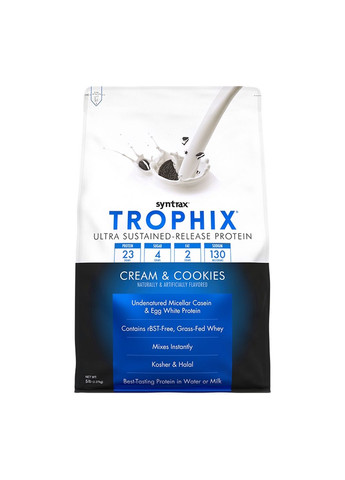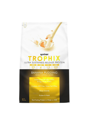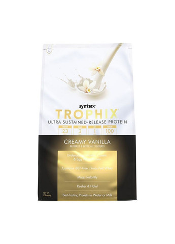 Trophix від Syntrax - це протеїновий продукт, заснований на суміші протеїнів різного типу. Як і його старший брат Matrix, його основними компонентами є сироватковий і молочний концентрат, яєчний альбумін, глютамінової пептиди і міцелярно казеїн. Так в чому ж критичне відмінність цих двох продуктів? Справа в тому, що в Trophix від Syntrax основний упор зроблений на казеиновую складову. Тобто даний вид протеїну має пролонговану властивість забезпечувати організм білком. Призначення Trophix Syntrax захист м `язів від катаболічних процесів і впливу кортизолу протягом тривалого періоду часу; джерело білка і амінокислот для організму; стимуляція збільшення силових показників; поліпшення харчування м `язів кров `ю і киснем; зміцнення імунітету; зміцнення серцево-судинної системи; захист від голоду протягом тривалого періоду часу (до 6 годин). Як приймати Trophix Syntrax Спосіб приготування і прийому стандартний для протеїнових продуктів - змішати один мірний совочок з 250-400 мл води або нежирного молока. Приймати після тренування, між прийомами їжі, а також перед сном для запобігання нічного катаболізму. Вміст елементів у 1й порції 35 грам Калорії 130 Жири 1.5 г - насичені 0.5 г - транс-жири 0 г Холестерин 10 мг Вуглеводи 7 г - цукор 4 г Харчові волокна 0 г Білок 23 г Натрій 100 мг Вітамін D3 (холекальциферол) 0.2 мг Кальцій 290 мг Залізо 0.9 мг Калій 120 мг Інгредієнти Суміш молочних білків (міцелярний казеїн, концентрат сироваткового білка), суміш немолочних білків (глютамінові пептиди, білок яєчного білка), цукор, натуральні та штучні ароматизатори, сіль, ацесульфам-К, сукралоза, лецитин. Склад може відрізнятися залежно від смаку. Виробник: Syntrax; Форма випуску: Порошок; Вага,г: 2270; Кількість порцій, шт: 65; Зміст порції: 35 грам; Вигляд: Комплексні; Зміст білка,%: 66; Вміст вуглеводів,%: 20; Зміст жирів,%: 4; Тип обробки: Комбінований; Вигляд за походженням: Змішаний; Принцип дії: Середня швидкість засвоєння; Вміст вуглеводів в 100 г: Низковуглеводні; Пол: Жіночий, Чоловічий; Вікова категорія: Дорослі; Країна виробника: США; Призначення: Для набору м'язової маси, Для загального відновлення, Для підвищення витривалості; Смак: Банан