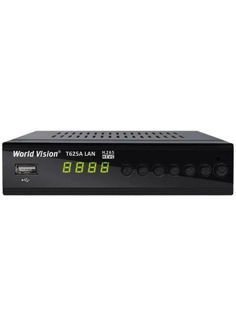 World Vision T625A Lan - це преміальна модель Т2 ресивера 2021 модельного року від відомого виробника. World Vision T625A Lan підтримує цифрові DVB-T/T2 і кабельне DVB-C формати телевізійного мовлення. Особливістю Т2 ресивера є наявність порту LAN для підключення мережі інтернет за допомогою кабелю. Ця функція відкриває доступ до встановлених додатків IPTV, Погода, Megogo та інших онлайн сервісів. Також у нової моделі обвалене графічне меню. На лицьовій панелі Т2 тюнера розташований світлодіодний LED дисплей Який показує поточний порядковий номер телеканалу в активному режимі та поточний час в режимі очікування, зліва від LED дисплея 5 додаткових кнопок управління, а праворуч один з USB портів. Бічні грані обладнані вентиляційними отворами для охолодження пристрою. На задній частині можна побачити LAN порт, другий USB роз'єм, RF IN, RF LOOP THROUGH для під'єднання антени, HDMI та AV для під'єднання телевізорів старих і нових типів, а також DC 5V/2A. Варто звернути окрему увагу на пульт дистанційного керування Який входить до комплектації Т2 тюнера. Пульт World Vision Т625ALAN є таким, що навчається, що дає можливість запрограмувати під свої потреби 4 кнопки, а саме - ввімкнення телевізора, регулювання гучності та перемикання режимів ТБ. Завдяки цьому не доведеться користуватися кількома пультами - достатньо комплектного для управління і ресиверів, і телевізором. Виконано World Vision T625A Lan з високоякісних матеріалів класичного чорного кольору. Характеристики Бренд Країна-виробник Тип Сигнал, що приймається Стандарти цифрового ТБ , , Максимальна роздільна здатність відео Додаткові функції , , Погода Підтримувані формати H.265, MPEG-2, MPEG-4 Роз'єми HDMI, RCA, RJ-45, USB, Антенний вихід (RF Loop Through), Антенний вхід (RF In) Особливості З пультом ДУ