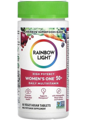 Вітаміни для жінок віком від 50 років (Women's One 50+) - це щоденний збалансований комплекс, що включає повний спектр вітамінів, мінералів, суперпродуктів та поживних речовин для підтримки оптимального харчування та поповнення запасів, підтримки активного способу життя жінок віком 50 років і більше. Виробник: Rainbow Lights, США Форма випуску: 60/90/120 таблеток Вік: 50+ Склад: Компонент Склад 1 таблетки Вітамін А (бета-каротин) 900 мкг (1500 МО) Вітамін С (аскорбінова кислота) 90 мг Вітамін D (D3 холекальциферол) 50 мкг (2000 МО) Вітамін Е (d-альфа-токоферилсукцинат) 15 мг (13.35 МО) Вітамін К (Phytonadione) 100 мкг Вітамін B-1 (Тіамін мононітрат) 6 мг Рибофлавін (вітамін В-2) 5.6 мг Нікотинова кислота (Niacinamide) 20 мг Вітамін В6 (Піридоксин HCl) 20 мг Фолієва кислота 400 мкг DFE (240 мкг фолієвої кислоти) Вітамін B-12 (Ціанокобаламін) 10 мкг Біотин 30 мкг Пантотенова кислота (Пантотенат кальцію) 13 мг Холін (холін-батартрат) 25 мг Кальцій (з багатих мінералами червоних водоростей) 100 мг Залізо (Amino Acid хелат) 6 мг Йод (Saccharomyces cerevisiae) 150 мкг Магній (оксид) 50 мг Цинк (цитрат) 11 мг Селен (селенометіоніну) амінокислота хелат) 55 мкг Мідь (Amino Acid хелат) 1 мг Марганець (цитрат) 5 мг Молібден (Хелат гліцинату) 45 мкг Органічна суміш райдужних суперпродуктів 65 мг Ботанічна суміш для жінок старших 50 років 125 мг Суміш імбиру, ферментів та пробіотиків 37 мг * Органічна суміш райдужних суперпродуктів: органічна спіруліна, органічний буряк, органічна броколі (рослина), органічна капуста (листя), органічний шпинат (лист), органічна ожина (фрукти), органічна лохина (фрукти), органічна морква (корінь), органічна журавлина (Фрукти). ** Ботанічна суміш для жінок старше 50 років: екстракт чорного клопогону (кореневище, корінь), екстракт гінкго (листя), екстракт ашваганди (корінь), органічна хлорела. *** Суміш імбиру, ферментів та пробіотиків: екстракт соку імбиру (кореня), бромелайн (зі стебла ананаса), папаїн (з плодів папаї), Bacillus coagulans MTCC 5856 (1 мільйон КУО). Інші інгредієнти: мікрокристалічна целюлоза, мальтодекстрин, покриття (гідроксипропілцелюлоза, гіпромелоза), кроскармелоза натрію. Не містить: ГМО, молока, горіхів, арахісу, сої, яєць, риби або молюсків. Функціональна дія: Комплекс спеціально розроблений для жінок старше 50 років, оскільки в цьому віці жіночий організм відчуває значний брак вітамінів і мінералів, починаються процеси в'янення на фізіологічному рівні, а також більше піддається розвитку багатьох захворювань. В організмі жінки відбуваються гормональні зміни – менопауза; збільшується крихкість кісток та ризик розвитку остеопорозу; знижується рівень естрогену, який важливий для підтримки еластичності судин, функцій серцево-судинної системи, запобігання утворенню атеросклеротичних бляшок та виникнення сильних перепадів тиску; зниження інтимного життя, пов'язане із сухістю піхви, зменшенням лібідо. Для того, щоб жінка почувала себе красивою і молодою в цьому віці, запобігти або послабити зміни, що проявляються необхідно стежити за здоров'ям, дотримуватися здорового харчування, правильного режиму дня, позбудеться шкідливих звичок, займатися спортом, зміцнювати нервову систему для боротьби зі щоденним стресом, а також не мало важливим є прийом мультивітамінних добавок. Вживання комплексу від ТМ Rainbow Light забезпечить захист організму жінки та підтримку під час вікових змін, сприяє підвищенню заряду енергії, підтримці функціонування 