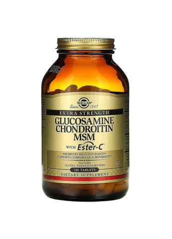 Відкрийте для себе силу спільної підтримки з продуктом Solgar Extra Strength Глюкозамін Хондроітин і МСМ з Естер-C. Ця унікальна формула містить 180 таблеток, кожна з яких збагачена високоякісними інгредієнтами, призначеними для підтримки здоров'я суглобів і поліпшення їхньої рухливості. Глюкозамін: Підтримує здоров'я хрящів і сприяє їх відновленню, відіграючи ключову роль у підтримці еластичності та міцності суглобів. Хондроїтин: Забезпечує амортизацію і пружність хрящів, допомагаючи запобігти їхньому зносу і підтримувати здоров'я суглобів. МСМ (метилсульфонілметан): Органічна сполука сірки, що сприяє загальному зміцненню суглобів і зменшенню запальних процесів. Естер-C: Посилена форма вітаміну C, яка підтримує імунітет, сприяє синтезу колагену та покращує засвоєння поживних речовин у суглобах. Solgar Glucosamine Chondroitin MSM with Ester-C розроблено для людей, які бажають підтримати здоров'я своїх суглобів і поліпшити їхню функціональність. Цей продукт особливо корисний для літніх людей, спортсменів і всіх, хто зазнає підвищених навантажень на суглоби. Препарат допомагає зменшити дискомфорт у суглобах, покращує їхню рухливість і сприяє відновленню хрящової тканини. Слова "Extra Strength" (додаткова сила) в назві продукту вказують на підвищену концентрацію активних інгредієнтів у формулі. Це означає, що препарат містить вищі дози глюкозаміну, хондроїтину, МСМ і Естер-C порівняно зі стандартними формулами. Така концентрація призначена для забезпечення інтенсивнішої підтримки здоров'я суглобів, поліпшення їхньої рухливості та зменшення дискомфорту, пов'язаного із суглобовими проблемами. "Extra Strength" зазвичай використовується в продуктах, призначених для людей, які потребують потужної підтримки суглобів через високі навантаження, вікові зміни або суглобові захворювання. Рекомендації щодо застосування Як харчову добавку для дорослих приймати по три (3) таблетки на день, бажано під час їди або відповідно до рекомендацій лікаря. Склад Розмір порції: 3 таблетки Порцій в упаковці: 60 Кількість в 1 порції % від добової норми Калорії 15 Усього вуглеводів 3 г 1%** Вітамін C (у вигляді Ester-C, аскорбату кальцію) 60 мг 67% Натрій† 120 мг 5% Глюкозамін сульфат (із глюкозаміну сульфату 2KCl) 1068 мг (1 г) *** Хондроїтин сульфат натрію 1200 мг (1,2 г) *** МСМ (метилсульфонілметан) (у вигляді OptiMSM) 700 мг *** ** Відсоток від добової норми за умови споживання 2000 калорій на день *** Добова норма не визначена † Природного походження. Додаткові інгредієнти: рослинна стеаринова кислота, рослинна целюлоза, діоксид кремнію, рослинний стеарат магнію, рослинний гліцерин. Містить молюсків (краби, лангусти, омари, креветки). Не містить: глютену, пшениці, молочних продуктів, сої, дріжджів, цукру, штучних ароматизаторів, підсолоджувачів, консервантів і барвників. Попередження Перед застосуванням добавок у період вагітності, годування груддю, приймання будь-яких препаратів, зокрема антикоагулянтів, або за наявності будь-яких захворювань слід проконсультуватися з лікарем. Особам, які страждають на діабет, слід приймати тільки під наглядом лікаря. При виникненні будь-яких небажаних реакцій слід припинити прийом і звернутися до лікаря. Зберігати в недоступному для дітей місці. Зберігати при кімнатній температурі. Не використовувати, якщо зовнішня захисна плівка відсутня або пошкоджена.