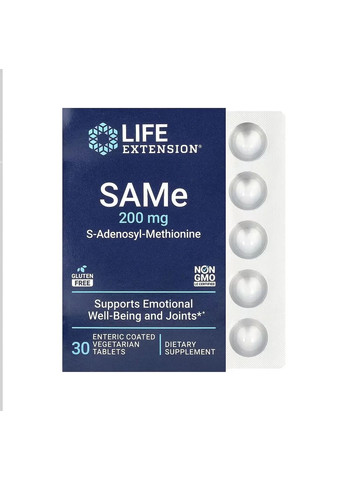 SAMe 200 мг Life Extension 30 таблеток SAMe від Life Extension – це високоефективний нутрієнт у вигляді ентеросолюбільних вегетаріанських таблеток, який містить 200 мг S-аденозилметіоніну (SAMe). Цей природний кофермент відіграє ключову роль у метилюванні, синтезі нейротрансмітерів та відновленні клітинних мембран. Завдяки спеціальному покриттю таблетки забезпечують доставку активної речовини безпечним чином у тонкий кишечник, мінімізуючи навантаження на шлунок. Склад та його дія S-аденозилметіонін (SAMe) — 200 мг Універсальний метил-донор: підтримує біосинтез серотоніну, допаміну, норадреналіну, бере участь у синтезі фосфоліпідів, глутатіону та детоксикації печінки. Целюлоза (раст., капсула) Забезпечує форму таблетки, безпечна та добре перетравлюється. Манітол Осмотичний наповнювач, покращує смакові та текстурні властивості. Метакрилова кислота кополимер Формує ентерофільне покриття, яке розчиняється у кишечнику. Лимонна кислота, стеаринова кислота, силіка Стабілізатори та антиадгезивні агенти для рівномірного виготовлення та зберігання форми таблетки. Гипромелоза Біодеградована полімерна оболонка з контрольованим часом розчинення. Гліцерил триацетат Пластифікатор, що забезпечує м’якість та цілісність покриття. Натрій крохмальний гліколят, кроскармеллоза натрію Дисинтегранти, які сприяють швидкому вивільненню SAMe у кишечнику. Кальцій карбонат, жовтий охра Корегенти твердості та кольору таблетки. Переваги та особливості Підтримка нейротрансмітерів — сприяє нормальному синтезу серотоніну та допаміну для покращення настрою та когнітивної функції. Зменшення симптомів депресії — клінічно доведена ефективність у покращенні емоційного стану при легких та помірних депресивних розладах. Здорова суглобова функція — володіє протизапальною дією, зменшує болючість та покращує рухливість при остеоартриті. Підтримка печінки — важливий компонент метаболізму глутатіону, сприяє детоксикації та відновленню клітин печінки. Ентерофільне покриття — захищає SAMe від руйнування в кислому середовищі шлунку, забезпечуючи максимальну біодоступність. Вегетаріанська формула — без желатину та інгредієнтів тваринного походження. Універсальність — підходить як для підтримки настрою, так і для зміцнення суглобів та метаболічного здоров’я. Показання до застосування Легкі та помірні депресивні стани, сезонні коливання настрою. Остеоартрит, біль та скутість у суглобах. Порушення функції печінки, необхідність детоксикації. Хронічна втома, зниження енергії та когнітивних здібностей. Підтримка психоемоційної рівноваги під час стресу. Спосіб використання Для підтримки суглобів: приймайте по 1 таблетці 6 разів на день у роздільних дозах, бажано натщесерце або за рекомендацією лікаря. Для підтримки настрою: приймайте по 1 таблетці 8 разів на день у роздільних дозах, краще натщесерце. Для оптимальної дії комбінуйте з вітамінами B6, B12 та фолієвою кислотою. Запивайте не менше 200 мл води під час кожного прийому. Додаткові поради Почніть з меншої частоти прийому та поступово збільшуйте дозу для коректного адаптаційного ефекту. Не рекомендується застосовувати при біполярних розладах без нагляду фахівця. Уникайте одночасного вживання з алкогольними напоями та препаратами, що змінюють метилювання. Зберігайте в сухому прохолодному місці, захищеному від яс