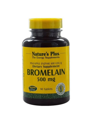 Бромелайн Bromelain 500 мг Nature's Plus, 90 таблеток Бромелайн від Nature's Plus — це високоякісний ферментний комплекс на основі натурального бромелайну, отриманого з ананасів. Він сприяє покращенню травлення, зменшенню запалення, підтримці імунної системи та сприяє швидшому відновленню після фізичних навантажень. Бромелайн допомагає розщеплювати білки, полегшуючи їх засвоєння організмом, а також знижує набряки і підтримує здоров'я суглобів. Рекомендується для людей із порушеннями травлення, спортсменів, при запальних процесах, а також для тих, хто хоче покращити загальний стан здоров’я. Основні характеристики та переваги Натуральний бромелайн з ананасів, 500 мг у таблетці Покращує травлення та засвоєння білків Зменшує запалення і набряки Підтримує імунітет і відновлення після навантажень Кому рекомендовано Рекомендується при проблемах з травленням, запальних захворюваннях, спортсменам і активним людям, а також тим, хто хоче покращити обмін речовин і загальний стан організму. Інструкція із застосування Приймати по 1 таблетці на день або за рекомендацією лікаря. Таблиця складу Інгредієнт Кількість на порцію (1 таблетка) Натуральний бромелайн (з ананасів) 500 мг