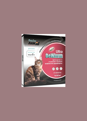 AnimAll VetLine DeWorm Ultra для кішок вагою від 2 кг проти круглих та стьожкових гельмінтів. Профілактика дирофіляріозу. Застосування: Таблетки призначають для профілактики та дегельмінтизації при захворюваннях, викликаних як личинковими формами, так і статевозрілими цестодами - Dipylidium caninum, Taenia spp., Echinococcus spp. та нематодами – Ancylostoma tubaeforme, Toxocara cati, Dirofilaria immitis (профілактика захворювання), в т. ч. при нематодозах, цестодозах, комбінованих нематодо-цестодозних інвазіях. Фармакологічні властивості ATC-vet QP534, ендектоциди (QP54АВ51, мільбеміцин, комбінації). Таблетки Деворм Ультра для кішок відносяться до групи ендетоцидів, що містять дві активні діючі речовини. Таблетки належать до групі комбінованих антигельмінтних препаратів нематодоцидної та цестодоцидної дії. Активні компоненти, що входять до складу препарату, забезпечують його широкий спектр антигельмінтної дії. Мільбеміцина оксим - макроциклічний лактон, що отримується в результаті ферментативної діяльності Streptomyces hygroscopicus var. Aureolacrimosus, активний відносно личинок і імаго нематод, паразитуючих в шлунково-кишковому тракті кішок, а також личинок Dirofilaria immitis. Механізм дії мільбеміцина обумовлений підвищенням проникності клітинних мембран для іонів хлору (Cl-), що призводить до надмірної полярізації мембран клітин нервової і м'язової тканини, паралічу і загибелі паразита. Максимальна концентрація мільбеміцина оксима в плазмі крові тварини досягається протягом 2-4 годин, біодоступність становить близько 80%. Із організму виводиться в основному в незмінному вигляді. Празиквантел є ацильованим похідним піразинізохіноліна, володіє вираженою дією проти цестод і нематод. Підвищуючи проникність клітинних мембран паразита для іонів кальцію (Ca2 +), викликає деполяризацію мембран, скорочення мускулатури і руйнування тегумента, що призводить до загибелі паразита і сприяє його виведенню з організму тварини. Максимальна концентрація празиквантель в плазмі крові тварин досягається через 1-4 години. Він піддається швидкій і практично повній біотрансформації в печінці. Рівень зв'язування в плазмі становить близько 80%, виводиться з організму протягом 2 діб в основному з сечею. Таблетки для кішок за ступенем впливу на організм відносяться до речовин малонебезпечних, в рекомендованих дозах не надають сенсибілізуючу, ембріотоксичну і тератогенну дії, добре переносяться котами різних порід і віку. Препарат токсичний для бджіл, а також риб і інших гідробіонтів. Протипоказання: Не застосовувати тваринам із відомою підвищеною індивідуальною чутливістю до компонентів препарату (у тому числі в анамнезі); Не застосовувати тваринам з вираженими порушенням функції нирок та печінки; Не застосовувати виснаженим тваринам та хворим на інфекційні хвороби; Не застосовувати кошенятам молодше 6-тижневого віку і масою тіла менше 0,5 кг. Особливостей дії препарату при його першому застосуванні і скасуванні не виявлено. Застереження: При передозуванні препарату у деяких тварин можуть спостерігатися пригнічений стан, слинотеча, парез м'язів, тремтіння і (або) хитка хода. Ці симптоми проходять спонтанно протягом доби, при необхідності тварині призначають засоби симптоматичної терапії. Не слід застосовувати кошенятам молодше 6-тижневого віку і масою тіла менше 0,5 кг. Можливість застосування препарату під час вагітності та ла
