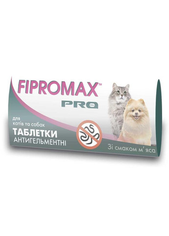 Таблетки від глистів для котів та собак зі смаком м'яса, 10 штук Fipromax PRO FIPROMAX PRO - антигельмінтики, що відрізняються високою ефективністю, дозволяють позбавити вашего улюбленця від паразитів вже після першого застосування Склад: 1 мл препарату: пірантелу памоат - 15 мг, празіквантел - 5мг. Допоміжні речовини: 1,2 -пропіленгліколь. Дозування: Вид тварини Маса, кг Кількість таблеток/штук Собаки, цуценята до 2 кг 1/4 Собаки 2-5 1/2 Собаки 6-10 1 Собаки 11-20 2 Собаки 21-30 3 Собаки 31-40 4 Собаки 41-50 5 Кошенята - 1/4 Дорослі кішки - 1/2