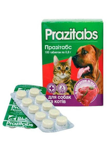Празитабс — ніжний антигельмінтний засіб для собак і кішок, 100 таблеток з ароматом м'яса. Застосовується для дегельмінтизації собак і кішок, лікування та профілактики у разі ураження цестодами, трематодами, нематодами. Циліндричні таблетки з плоскою поверхнею, ризиком і фаскою, від білого до жовтого кольору зі специфічним запахом. Склад 1 таблетка (0,8 г) містить активні речовини: празиквантел 50 мг; пірантила памоат (ембонат) 150 мг. Фармакологічні властивості АТСvet QP52A, антигельмінтні ветеринарні препарати; протитрематодні, протинаматодні та протицестонні ветеринарні препарати. Празиквантел активний проти стрічкових гельмінтів — цестод і трематод. Пірантела памоат (ембонат) активний щодо круглих гельмінтів — нематод. У щільноїдних препарат ефективний у разі цестодозах: ехінококозу (смугові форми Echinococcus granulosus), тінідозах (Taenia multiceps, Taenia hydatigena, T.ovis, T.pisiformis, Hydatigena taeniaeformis), дипилидиозе (Dipylidium caninum — статевозрілі та молоді форми), дифілоботріозу (Diphyllobothrium latum); при трематодозах (Opisthorchis felineus); у разі нематозів собак і кішок: токсокозі (Toxocara canis, Toxocara cati), токсаскарозе (Toxascaris leoninа), трихурозе (Trichuris spp.), анкилостомозе (Ancylostoma caninum), унцинариозе (Uncinaria stenocephala), дирофиляриозе (Dirofilaria repens, D. immitis). Протипаразитарна дія препарату зумовлена комбінацією складників, які проявляють синергічну дію на дорослі та личинкові форми плоских і круглих гельмінтів. Застосування Лікувально-профілактична дегельмінтизація собак і кішок у разі ураження цестодами, трематодами, нематодами. Дозування Перорально одноразово з кормом або безпосередньо на корінь язика перед годуванням у дозах, зазначених у таблиці: Маса тіла тварини, кг Доза препарата, таблеток Собаки: до 2 1/4 2-5 1/2 5-10 1 10-20 2 20-30 3 30-40 4 40-50 5 Кішки 1/2 Котята 1/4 Дегельмінтизацію рекомендується проводити щомісячно (4 рази на рік). Цуценята та кошенят рекомендується дегельмінтизувати з місячного віку. Протипоказання Не використовувати тваринам у першій половині вагітності. Застереження В окремих випадках маловіроятна діарея, гіперсаливація, блювота, яка зникає самостійно. Форма випуску Блістерні паковання по 10, 30, 100 таблеток, які упаковують у картонні коробки. Зберігання Сухі, темні, добре вентильовані (вологість не більш ніж 75%) приміщення за температури від 2 °C до 25 °C. Зберігати окремо від харчових продуктів і кормів для тварин. Термін придатності — 3 роки від дати виготовлення.