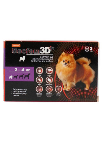 Протипаразитарні таблетки проти бліх і кліщів для собак вагою 2-4 кг Secfour 3D, 2 таб/уп-0,2 г СЕКФОР 3D Протипаразитарні таблетки для собак — паразитицидний препарат, що застосовується для профілактики та лікування собак проти ектопаразитів і ендопаразитів (бліх, кліщів тощо), а також проти круглих гельмінтів. Застосування Лікування та профілактика собак при змішаних паразитарних інвазіях, спричинених еко- та ендопаразитами: • іксодовими кліщами (Dermacentor spp., Rhipicephalus spp., Ixodes spp.); • саркоптоїдними кліщами (Otodectes cynotis, Sarcoptes scabiei); • волосяними (Trichodectes canis); • вошами (Linognathus setosus); • нематодами травного каналу та дихальних шляхів (Toxocara canis, Toxascaris leonina, Ancylostoma spp., Uncinaria spp., Trichuris vulpis, Strongyloides stercoralis, S. canis, Angiostrongylus vasorum). • Профілактика алергічного блошиного дерматиту (flea allergy dermatitis: FAD). • Профілактика дирофіляріозу: Dirofilaria spp. (мікрофілярії L3 та L4 стадій). Після одноразового застосування препарату його протипаразитарна дія триває до 5 тижнів. При ктеноцефаледозі (ураження блохами), отодектозі та іксодидозах таблетки застосовують одноразово, для запобігання повторній інвазії один раз на 4-6 тижнів, протягом усього сезону активності ектопаразитів. Акарицидна дія препарату проявляється через 24 години, враховуючи це, обробки слід проводити не пізніше ніж за 24 години до передбачуваного вигулу тварини в місцях можливого проживання кліщів (парки, сквери, ліси). Інсектицидна дія препарату проявляється через 24 години, досягаючи максимального рівня через 48 годин. Склад 100 мг препарату містять діючі речовини (мг): • імідаклоприд — 2,4; • люфенурон — 20,0; • мільбеміцину оксим — 0,6; Допоміжні речовини: фітокомплекс, лактоза, крохмаль, ароматизатор штучний, аеросил, кальцію стеарат. • Імідаклоприд — належить до групи хлорнікотинових сполук. Приєднуючись до нікотинергічного рецептора ектопаразита, розміщеного на постсинаптичному нейроні, перериває передачу нервового імпульсу та спричиняє його загибель. • Люфенурон (з’єднання групи бензоїлфенілсечовини) — це інсектицид широкого спектру дії, особливо активний проти бліх видів Ctenocephalides spp., Pulex irritans та володіє підвищеною ларвоцидною і контактною овіцидною активністю. Механізм дії полягає у блокуванні синтезу хітину, що є основним компонентом екзоскелету комах, тому личинки при линьці не можуть сформувати нову кутикулу і гинуть. • Мільбеміцину оксим активний щодо дорослих та молодих особин Toxocara canis, Uncinaria spp., Ancylostoma spp. і їх личинок (L4, L5), а також личинок (L4) Dirofilaria spp. Дозування Препарат призначений для перорального застосування (per os). Таблетки приємні на смак і охоче споживаються більшістю тварин, коли їх пропонують власники. Якщо таблетка не приймається тваринами добровільно, її можна давати з їжею або безпосередньо в ротову порожнину. Слідкуйте за тим, щоб тварини споживали повну дозу, а за обробки великих собак слід спостерігати кілька хвилин після введення, щоб переконатися у відсутності викидання таблетки з рота тварини. При сильній інвазії через 30–60 днів рекомендується повторна доза. Препарат застосовують собакамперорально з кормом або примусово з розрахунку, відповідно до наступної схеми: Вага таблетки, г Маса тіла тварини, кг Імідаклоприд, мг Люфенурон, мг Мільбеміцину оксим, мг 0,2 2,0–4,0 4,8 40,0 0,2 0,4 4,0–8,0 9,6 80,0 1,2 0,8 8,0–16,0 19,2 160,0 2,4 1,6 16,0–32,0 38,4 320,0 9,6 Застереження: Одночасне призначення з іншими засобами може викл