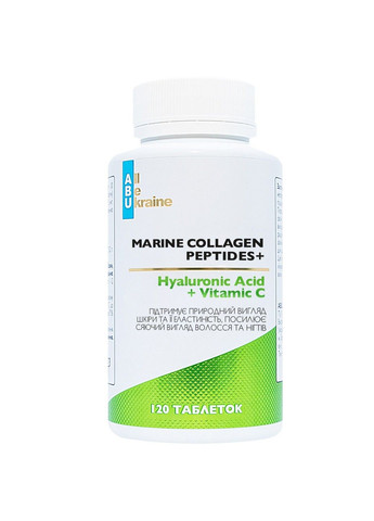 Зустрічайте комплекс краси з морським колагеном All Be Ukraine Marine Collagen Peptides+, що містить 120 таблеток для підтримки здоров'я та краси шкіри, волосся та нігтів. Цей продукт поєднує в собі силу гідролізованих пептидів риб'ячого колагену з антиоксидантами, вітамінами та мінералами, що сприяють загальному благополуччю. Склад на 1 таблетку: Пептиди риб'ячого колагену (гідролізовані) (500 мг): Основний компонент для підтримки еластичності та міцності шкіри. Вітамін С (аскорбінова кислота) (25 мг): Сприяє синтезу колагену та захищає шкіру від вільних радикалів. Екстракт чорниці (25 мг): Багатий антиоксидантами, що підтримують здоров'я шкіри та зору. Гіалуронова кислота (гіалуронат натрію) (15 мг): Забезпечує глибоке зволоження та покращує вигляд шкіри. Цинку цитрат (10 мг): Необхідний для підтримки здоров'я шкіри, волосся та нігтів. Вітамін В7 (біотин) (400 мкг): Відіграє важливу роль у підтримці здоров'я волосся та нігтів. Переваги продукту: Покращує стан шкіри, роблячи її більш гладкою та сяючою. Сприяє міцності та еластичності волосся, запобігаючи їх випадінню. Зміцнює нігті, роблячи їх менш схильними до ламкості та розшарування. Захищає шкіру від оксидативного стресу та негативного впливу зовнішнього середовища.