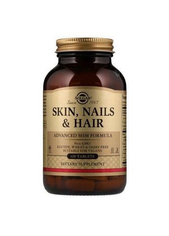 Вітаміни для шкіри, нігтів та волосся SOLGAR "Skin, Nails & Hair" - це унікальна формула для підтримки волосся, шкіри та нігтів, для забезпечення краси та здоров'я. Цей препарат призначений для підтримки рівня колагену, основного компонента шкіри, нігтів та волосся, кількість якого з віком знижується. Збалансований склад дозволяє шкірі надавати пружність, еластичність; захищати від згубного впливу УФ-променів; регулювати діяльність сальних залоз; зміцнювати волосся та нігті. Основу комплексу «Шкіра, волосся, нігті» становить ЧСЧ (метилсульфонілметан) – джерело органічної сірки, основний компонент кератину (будівельний елемент волосся та нігтів), а також колагену (основний компонент шкіри, нігтів та волосся), який відіграє важливу роль для молодості вашої шкіри, міцності нігтів та блиску волосся. Завдяки тому, що таблетки SOLGAR містять набір життєво важливих мікроелементів та амінокислот, покращується загальне самопочуття: стають більш гнучкими суглоби, зміцнюються зв'язки, знижується втома. Вже через невеликий відрізок часу після початку включення в раціон волосся стає більш слухняним і м'яким, кінчики не січуться, а їх володарка побачить у дзеркалі помітний результат. Це дієвий метод зупинити випадання волосся, зміцнити волосяні цибулини, а також оздоровити як саме волосся, так і шкірний покрив. Паралельно нігтьова пластина стане міцнішою, перестане шаруватися, а кутикула буде здоровою без задирок і тріщин. Добавка також покращить стан шкіри, прибере явні дефекти, вирівняє структуру шкірного покриву, подарує рівний тон та природний рум'янець. Особливо це актуально для людей з ослабленим імунітетом, для тих, хто переніс тяжкі захворювання після вагітності або в післялактаційний період. Саме в цей час виснажений організм вимагає підвищеної уваги та додаткового насичення вітамінами, мінералами та амінокислотами. Якщо не заповнити дефіцит, то це негайно позначиться на здоров'ї та красі. Цей продукт покращує функціонування імунної системи, забезпечуючи злагоджену роботу всього організму загалом. СКЛАД ДОБАВКИ: L-аскорбінова кислота (вітамін С) проявляє потужні антиоксидантні властивості, стимулює клітинне оновлення і синтез колагену, перешкоджає утворенню пігментних плям, підвищує імунітет організму; за рахунок чого прискорюються обмінні процеси в організмі, збільшується вироблення колагену та еластину; Метилсульфонілметан активізує синтез колагену та кератину, знижує ризик алергічних реакцій; Кремній зміцнює колаген-еластиновий каркас шкіри, підвищує міцність нігтів та волосся, бореться з хвороботворними бактеріями, мікроорганізмами та грибками; L-пролін та L-лізин – амінокислоти, необхідні для виробництва колагену, регенерації пошкоджених тканин, зміцнення волосся та нігтів. РЕКОМЕНДАЦІЇ З ВИКОРИСТАННЯ: Приймати по дві (2) таблетки на день, переважно з їжею або за вказівкою лікаря. Не перевищуйте рекомендоване дозування. ІНФОРМАЦІЯ ПРО ДОДАВКУ: Розмір порції: 2 таблетки; порцій в упаковці: 30. Зміст елементів в 1 порції: Вітамін C (у вигляді L-аскорбінової кислоти) 120 мг; Цинк (у вигляді цитрату цинку) 15 мг; Мідь (у вигляді амінокислотного хелату гліцинату міді) 2 мг; ;Діоксид кремнію (у вигляді діоксиду кремнію та L. calcareum [порошок з червоних водоростей]) 50 мг;L-пролін 50 мг;L-лізин (у вигляді гідрохлориду L-лізину) 50 мг. Інші інгредієнти: М