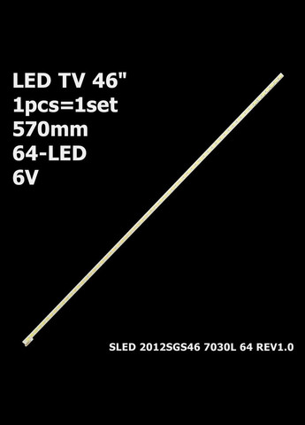 Артикул: ART-12001 Тип підкладки: алюміній Довжина планок: 570 мм Ширина планок: У вузькій області: 7 мм У широкій області: 10 мм Напруга одного світлодіода: 6V Кількість контактів на роз'ємі: 5 pin Кількість світлодіодів на планці: 64 LED Відстань між світлодіодами по центру: 9 мм Відстань між центром 1-го та останнього LED: 554 мм Маркування планок: SLED 2012SGS46 7030L 64 REV1.0 Підсвітка підійде до моделей: Haier: LE46A700K, LE46A700 Konka: LED46X5000D Philips: 46PFL5527T/60, 46PFL5007H/12, 46PFL5507T/60, 46PFL5537T/60, 46PFL5537K/12 Samsung: LH46DECPLBA/ZA, LA46N71BX Sanyo: DP46142 SSD46TA-00 TCL: L46E5000-3D, L46V7300A-3D, L46U4010A-3D, L46U4000A-3D Thomson: 46FU7765 Toshiba: 46HL150, 46KL300C, 46EL300, 46EL300C, 46L5200U, 46L5200U1, 46TL968, 46ML933RB, 46TL938RB, 46TL963RB, 46ML963RB, 46PS20V1, 46TL938G, 46TL933, 46HL150C, 46TL963B, 46TL963G, 46TL966B, 46TL966G, 46TL968B, 46TL968G та інші. Аналоги планок: BN96-00998A LJ07-00998A LJ64-03471A (радіатор) LJ64-03495A (радіатор) LJ07-01041A (радіатор) LJ07-01042A (радіатор) STS460A89 64LED, STS460A89_64LED STS460A89_64LED_L_type_rev.4_120410_LJ07-01042A STS460A89_64LED _ RTYPE _ REV.4_120410_LJ07-01041A (LTYPE, LJ07-01042A) Підсвічування матриці (панелі): LTA460HQ18, LTA460HQ20, LTA460HN05, LTA460HW04, LTI460HN06 УВАГА: Перед продажем кожна планка пройшла перевірку своєї працездатності за допомогою спеціального тестера. Наголошуємо, що не рекомендується використовувати пристрої, які не призначені для цього, для перевірки світлодіодних лінійок. В нашому асортименті є спеціальні пристрої, призначені саме для перевірки працездатності LED-підсвітки. Також рекомендуємо перевірити довжину планок, відстань між центрами лінз, які зазначені в описі товару, а також переконатися, що конектор для підключення відповідає фото і візуальному розташуванню отворів для кріплення. Варто зазначити, що на одному телевізорі можуть бути встановлені різні види планок, а також відстань між центрами лінз може не збігатися, особливо для деяких бюджетних моделей телевізорів. Також рекомендуємо перевірити довжину планок, відстань між центрами лінз, які зазначені в описі товару, а також переконатися, що конектор для підключення відповідає фото і візуальному розташуванню отворів для кріплення. Варто зазначити, що на одному телевізорі можуть бути встановлені різні види планок, а також відстань між центрами лінз може не збігатися, особливо для деяких бюджетних моделей телевізорів.
