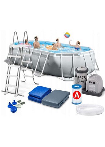 Перевага овального басейну, порівнюючи з прямокутним — те, що за купанні, кутові місця в басейні використовуються рідше, ніж усі інші. В Отже, об'єм води в овальному басейні набагато менший, ніж у прямокутному. Заощаджується чимала кількість води, а також ресурси на очищення (хімічні реагенти, фільтрація, електроенергія тощо) Цей басейн Intex 26796 привабливого сірого кольору має дуже зручні місткі розміри. Цей басейн сприятливо вирізняється збільшеною надійністю й підвищеним терміном експлуатації. Він обладнаний міцнішим каркасом, ніж інші моделі басейнів, наприклад, Metal Frame Pool. Стойки каркаса розташовані за периметром басейну під кутом, що й послужило назвою — Prism Frame Pool (дослівно Призма Каркас Басейн). Цей каркас легко монтується з міцних сталевих оцинкованих труб. Басейн оптимально розміщується на прямокутних зон саду або дачних газонах. У складеному упакованому вигляді басейн дуже компактний, що сприятливо для його транспортування. Басейн можна встановити в будь-якому зручному рівному місці, зокрема на пляжі. Цей басейн комплектується фільтрувальним картриджним насосом продуктивністю 5678 л/год (тип картриджа A), що добре очищає воду. У комплекті зручна драбина. Матеріал чаші виготовлений за особливою технологією з полівінілхлориду. Цей міцний матеріал виготовляється з 3 сплавлених шарів. Він стійкий до променів сонця, розтягування та стирання. Басейн укомплектований спеціальною підстилкою під днище. Тент-кришка — у комплекті. Передбачений зручний злив води з відведенням її в потрібне місце. Для цього необхідно лише під'єднувати шланг потрібного діаметра до зливного клапана, розміщеному на днищі. Детальний опис, характеристики: Intex 26796 Характеристики Довжина: 503 см Ширина 274 см Висота 122 см Інформація (ДxШxВ) 503 x 274 x 122 см Вага 113,3 кг Висота сходів 122 см Гарантія не передбачена Каркас оцинковані сталеві труби Драбина Є Матеріал тришаровий ПВХ: два шари ПВХ і шар скловолоконної сітки Насос-фільтр картриджний 5678 л/год Об'єм води 13365 л Підстилка Є Виробник Intex Серія PREMIUMPOOL SERIES Зливний клапан є Країна виробник Китай Тент Є Паковання картонна коробка Форма Овальний Колір сірий
