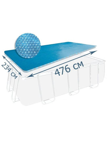 Сонячний тент запобігає потраплянню бруду на поверхню води і зменшує її випаровування, однак, завдяки використанню прозорої плівки (голубуватого відтінку) та комірчастої структурі, він не перешкоджає відображення сонячних променів від поверхні води і дозволяє воді прогрітися швидше. Ще однією особливістю даного тенту є відсутність будь-яких кріплень (він плаває на поверхні води). І якщо звичайний тент більше призначений для довготривалого захисту басейну, то даний тент зручно використовувати ввечері за ніч вода охолоне менше, а вже з першими променями сонця вона почне нагріватися. Тип - солярний тент (антиохлаждение). Колір - синій. Розмір (фактичний) - 476-234 см. Особливість матеріалу - водовідштовхувальний, з осередками повітря. Матеріал - поліетилен. Особливість, специфіка продукції з резини / ПВХ в тому, що матеріал досить чутливий до впливу зовнішніх факторів (наприклад: до пошкоджень гострими предметами і т.д.). Виходячи з цього, пошкодження товару з ПВХ, пов'язані з витоком: мікро проколи, проколи, подряпини, порізи, розриви (відпливу), деформація, як наслідок перекачування, відносяться виробником до пошкоджень під час експлуатації, тому гарантія від виробника не надається. З цією інформацією можна детальніше ознайомитися в інструкції-вкладиші якої виробник комплектує кожну упаковку товару.