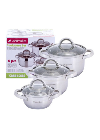 Набір каструль Kamille з силіконовими ручками — це основні кухонне приладдя, які є найбільш важливими елементами на кухні. Набір містить каструлі різних розмірів , що дозволяє готувати апетитні страви з безлічі інгредієнтів. Такі каструлі це завжди смачне і здорове приготування їжі. Каструлі виконані з якісної нержавіючої сталі з застосуванням сучасних технологій виробництва. Такі каструлі мають прекрасний зовнішній вигляд, оснащені капсульної дном і відрізняються високою міцністю і довговічністю у використанні. Матеріал: нержавіюча сталь c силіконовими вставками на ручках. Кришка: жароміцне скло. Кількість предметів в наборі: 6. Комплектація: каструлі 1.8 л (Ø16*9.5 см), 2.5 л (Ø18*10.5 см), 3.5 л (Ø20*11.5 см). Тип дна: капсульне. Мірна шкала: так. Спосіб кріплення ручок: клепочное. Тип ручок: порожнисті. Кришка з отвором для виходу пари: так. Обробка металу: дзеркальнийсатин. Тип плити: електрична, склокерамічна, індукційна, газова. Підходить для миття в посудомийній машині: так. Упаковка: кольорова картонна коробка 23,5*23,5*25см. Особливості: виготовлені з високоміцної нержавіючої сталі, не піддається корозії і потьмяніння ідеальні для інтенсивного використання, стійкі до зносу відрізняються високою теплопровідністю і розподілом температури, що забезпечує швидке нагрівання і тривале утримання тепла усередині всіх каструль є мірна шкала з'єднання ручок виконано клепочнім способом на кожній кришці передбачено отвір для виходу пари зовнішня поверхня з дзеркально-сатиновою поліруванням підходять для всіх видів плит підходять для миття в посудомийній машині Догляд за посудом: перед початком використання необхідно видалити з виробу всі ярлики і елементи упаковки, ретельно вимити і просушити виріб після кожного використання дочекатися охолодження виробу, потім ретельно вимити і просушити не рекомендується використовувати абразивні миючі засоби і металеві щітки Використання та правила безпеки: не піддавати вироби різким змінам температури не залишати порожній посуд на вогні уникати потрапляння полум'я на ручки і бічні стінки посуду не використовувати гострі металеві аксесуари