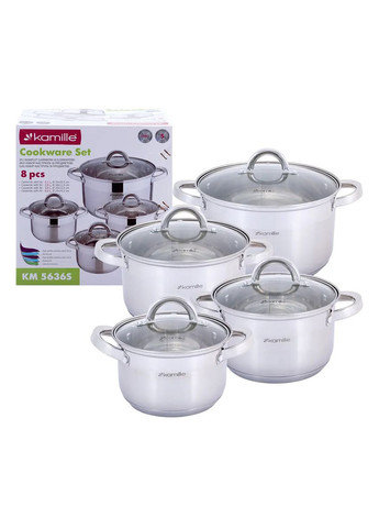 Набір посуду Kamille — це завжди смачне і здорове приготування їжі. Посуд виготовлений з якісних матеріалів із застосуванням сучасних технологій виробництва та відрізняється високою міцністю і довговічністю у використанні. Такий посуд неодмінно порадує Вас своєю практичністю і зручністю, а її естетичний дизайн обов'язково підійде до інтер'єру Вашої кухні. Матеріал: нержавіюча сталь. Матеріал кришки: жароміцне скло. Кількість предметів в наборі: 8. Тип дна: 3-ти шарове індукційне. Мірна шкала: є. Спосіб кріплення ручок: клепочное з'єднання. Тип ручок: порожнисті. Кришка з отвором для виходу пари: так. Обробка металу: сатин. Тип плити: електрична, склокерамічна, індукційна, газова. Підходить для миття в посудомийній машині: так. Набір включає: каструля 1,5 л (Ø16*10) каструля 2л (Ø18*10,7 см) каструля 3л (Ø20*12см) каструля 5л (Ø24*13,8 см) Особливості: виготовлена з високоміцної нержавіючої сталі, не піддається корозії і потьмяніння ідеальна для інтенсивного використання, стійка до зносу має п'ятишарові капсульне дно відрізняється високою теплопровідністю і розподілом температури, що забезпечує швидке нагрівання і тривале утримання тепла придатна для будь-яких видів плит придатна для миття в посудомийній машині зручна у використанні та догляді Використання та правила безпеки: не піддавати вироби різким змінам температури не залишати порожній посуд на вогні уникати потрапляння полум'я на ручки і бічні стінки посуду не використовувати гострі металеві аксесуари не насипати сіль в порожню посуд або посуд з водою, яка ще не закипів Догляд за посудом: перед початком використання необхідно видалити з виробу всі ярлики і елементи упаковки, ретельно вимити і просушити виріб після кожного використання дочекатися охолодження виробу, потім ретельно вимити і просушити не рекомендується використовувати абразивні миючі засоби і металеві щітки