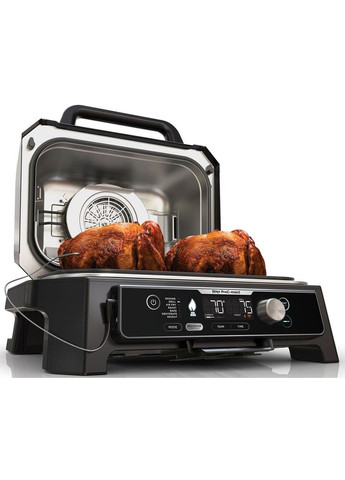 Незалежно від того, чи збираєтеся ви організовувати велике барбекю на вихідних, надолужувати втрачене за невимушеним обідом, або готуєте їжу на свіжому повітрі в середині тижня, у вас є чим зайнятися краще, ніж стояти біля свого барбекю. Ninja Woodfire Pro Connect BBQ Grill & Smoker дозволяє контролювати процес готування прямо з телефону, даючи вам повну свободу розслабитися і провести дорогоцінний час з друзями та родиною. Жодного зависання над грилем. Повний контроль приготування на долоні. Ніколи не пропустіть жодного кроку з програмою Ninja Pro Connect: Програмовані сценарії приготування: оберіть свою програму, а BBQ Grill зробить все інше, використовуючи вбудований цифровий кулінарний термометр, щоб приготувати їжу потрібної прожарки. Відрегулюйте час і температуру приготування, а також додайте смак гранул Woodfire прямо з програми. Моніторинг реального часу: перевірте, скільки часу на приготування залишилося. Оповіщення у реальному часі: отримуйте оповіщення, коли настане час забрати їжу, перевернути і т.д. Місткість XL: цей великий гриль для барбекю на відкритому повітрі має на 30% більше потужності, тому ви можете помістити ще більше улюблених страв. Ідеально підходить для розміщення, велика плита для гриля розміром 45 см x 29 см вміщує до 10 гамбургерів, 40 хот-догів, 2 повних ребер або двох цілих курей вагою до 3 кг. Кошик фритюру може смажити до 1,8 кг продуктів, що ідеально підходить для чіпсів і гарнірів. Крім того, доповніть будь-яку функцію приготування їжі технологією Woodfire, спалюючи справжні гранули для отримання димного аромату, який ви можете побачити і спробувати. Працює від електрики, він безпроблемний, швидко нагрівається та безпечний для використання у садах, на внутрішніх двориках, у кемпінгах, на балконах та інших невеликих відкритих просторах. Ні вугілля, ні газу, ні вогню. Немає необхідності турбуватися про те, що їжа буде сира або підгорить: Вбудований термометр для барбекю завжди гарантує ідеальне приготування м’яса та риби. Просто вставте цифровий зонд в їжу, а потім скористайтеся програмою або елементами керування грилем, щоб вибрати тип страви та ідеальну обробку, від легкої до добре прожареної. Система Smart Cook постійно контролює температуру їжі під час приготування і повідомляє вам, коли її можна вийняти, щоб ви могли розслабитися і насолоджуватися барбекю без стресу. Більш ніж барбекю з 7 функціями приготування: BBQ Grill класичні бургери, ковбаски, стейки, шашлики, смажені халумі, фахітас, кукурудза в качанах та багато іншого, все з автентичною обсмажуванням та обвуглюванням. Гриль досягає високих температур 260°C, а нагрівальні елементи вгорі та внизу працюють з конвекційним вентилятором для рівномірного приготування. Коптильня для барбекю: вбудована коптильня спалює натуральні гранули для створення справжнього, насиченого смаку барбекю, а конвекційний вентилятор рівномірно поширює тепло і дим навколо їжі. Низьке та повільне копчення ідеально підходить для приготування м’яких грудинок, копчених ребер, цілих курчат та великих шматків м’яса для повноцінного смаку копченості. Аерофритюрниця: До 75% менше жиру, ніж у фритюрі. Зробіть свої страви зіркою шоу, включаючи чіпси, скибочки, картопля в мундирі та палички моцарелли, або приготуйте і хрумкі заморожені улюблені страви, зокрема вегетаріанські бургери та нагетси. Крім того, доповніть б