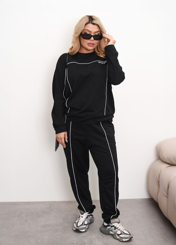 Спортивний костюм виготовлений двонитки, яка має гладку фактуру. Тканина має середню еластичність, враховуйте це під час підбору розміру. Завдяки своєму вільному фасону гарно сідає по фігурі. Костюм складається зі світшоту та штанів вільного фасону на м'яких манжетах. Світшот з довгими суцільнокроєними рукавами, завдяки чому створюється вільний силует. Світшот має круглий виріз горловини, додатково прикрашений кантом та термоналіпкою. Штани-джогери з високою посадкою та гумкою на талії, по боках дві бічні кишені з відрізним бочком. 48-50 р-р: Світшот: ОГ 116, ОТ 114, ОС 114, довжина світшоту 64, довжина рукава 73; Штани: ОТ 72-92, ОС 110, довжина штанів 104; 52-54 р-р: Світшот: ОГ 124, ОТ 122, ОС 122, довжина світшоту 66, довжина рукава 73; Штани: ОТ 78-100, ОС 118, довжина штанів 104; 56-58 р-р: Світшот: ОГ 132, ОТ 130, ОС 130, довжина світшоту 68, довжина рукава 75; Штани: ОТ 84-114, ОС 124, довжина штанів 106; 60-62 р-р: Світшот: ОГ 140, ОТ 138, ОС 138, довжина світшоту 68, довжина рукава 75; Штани: ОТ 88-118, ОС 132, довжина штанів 106; Виміри робились по верхній частині готового виробу. ОГ — об'єм грудей. ОТ — об'єм талії. ОС — об'єм стегон.